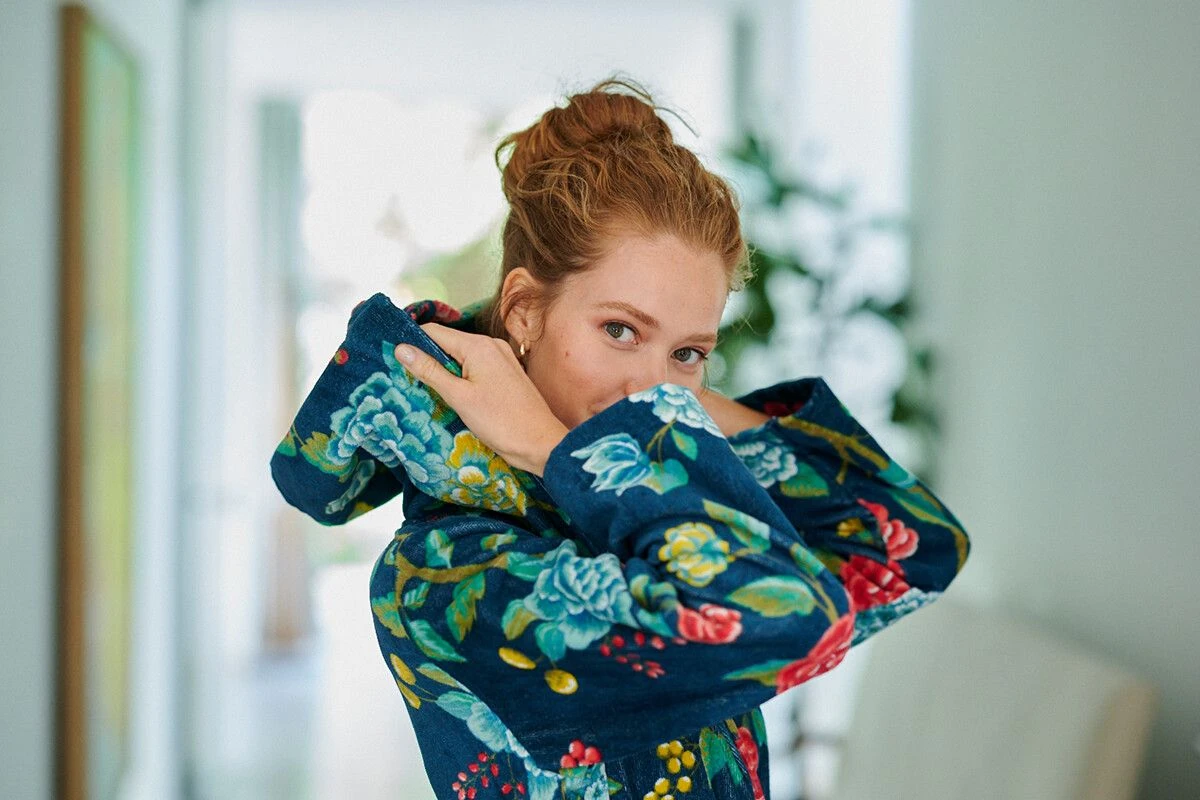 Add a touch of luxury to your nightwear wardrobe with this supersoft velour bathrobe. This dark blue Good Evening bathrobe is great to wear in the morning or at the end of the day. The bathrobe adorns a design of elegantly drawn oriental flowers and butterflies fly between the flowers. The print includes the colours yellow, blue, green, pink, red, and white. The inside of the bathrobe is darkblue. Made from 100% high-quality cotton terry velour, the bathrobe feels super-soft, plump, and thick. It has excellent moisture-absorbing, breathable, and quick-drying qualities. The bathrobe has a hood, pockets, and a long belt. The bathrobe should be washed before use according to the label.