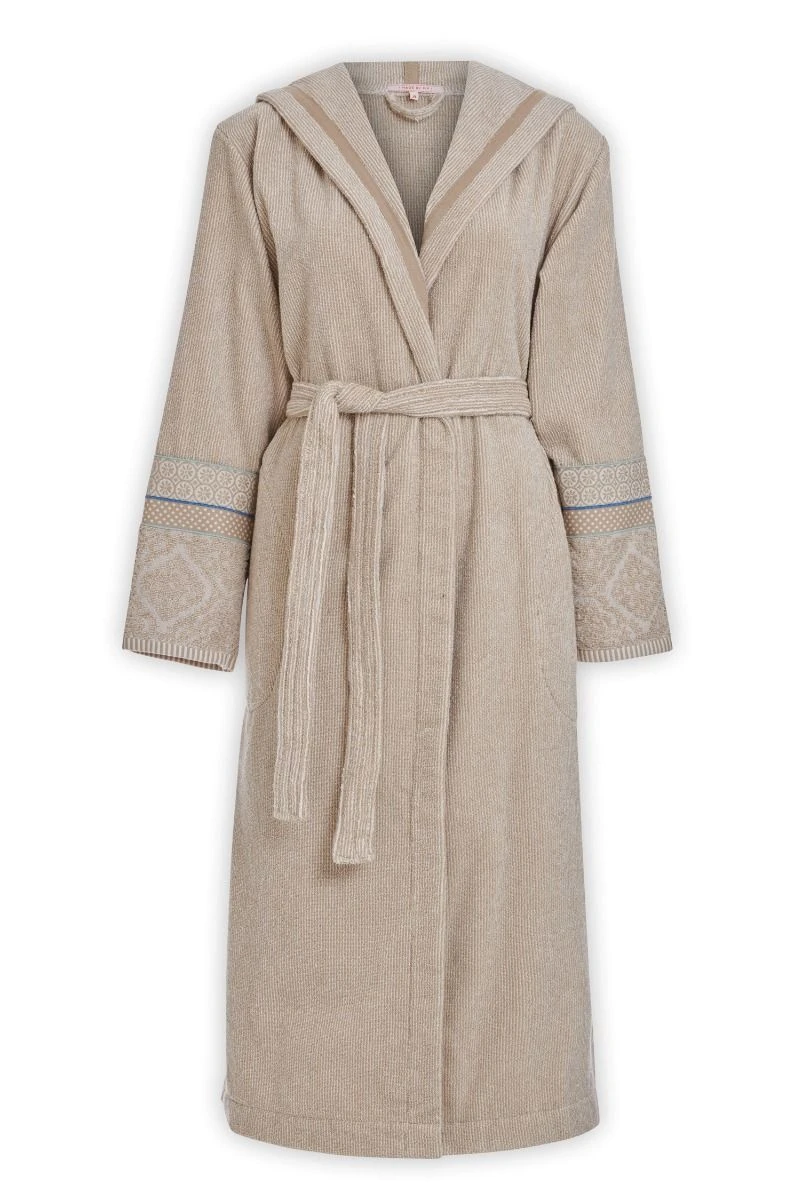 This long khaki bathrobe with fine stripes is from the Soft Zellige collection. The sleeves are finished with blue piping and a jacquard pattern. The bathrobe has side pockets and a hood. The bathrobe should be washed before use according to the care label.