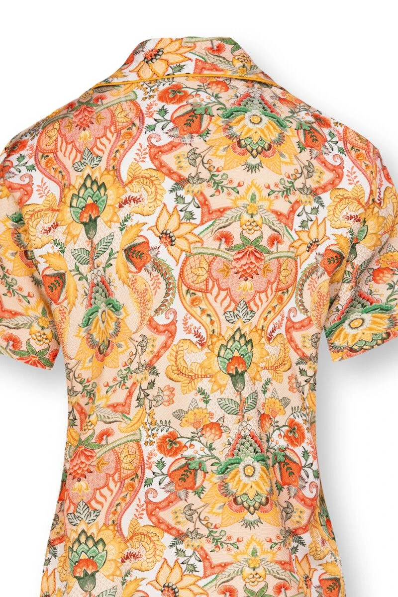 Prefer a casual yet fashionable look? This comfortable Floor blouse in yellow is the perfect basic item. Made of viscose for exceptional comfort. Decorated with the Kyoto Festival design, a repetitive floral design featuring a variety of fanciful chintz flowers and leaves. Symmetrically placed flower branches with elaborately decorated flowers give the design a luxurious flair. Mix & match this blouse with the items in the new homewear collection for a gorgeous combination.