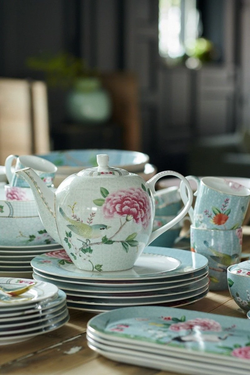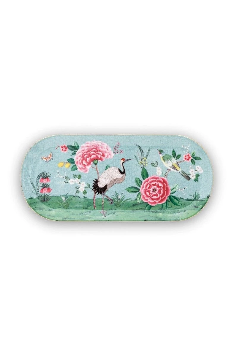 This blue rectangular cake platter is decorated with exotic flowers, tropical birds, a butterfly and golden details. The background has an elegant design. Combines beautifully with the pastry plates and coffee and tea porcelain sets in the Blushing Birds collection.