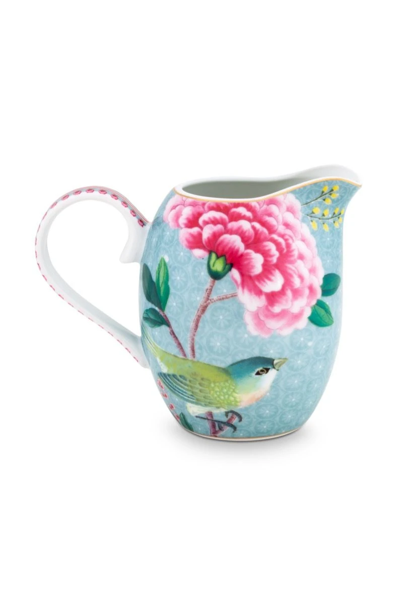 This blue milk jug is decorated with exotic flowers, golden details and a bird. The background has an elegant print and an element from the design adorns the inside of the spout. Combines beautifully with the other coffee and tea sets in the Blushing Birds collection.