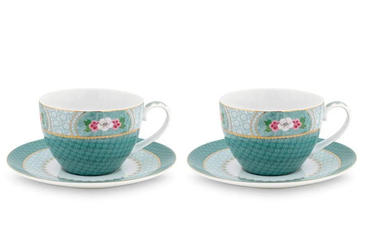This blue cappuccino cup and saucer set is decorated with a blue design, exotic flowers and golden details. Combines beautifully with the other coffee sets in the Blushing Birds collection.