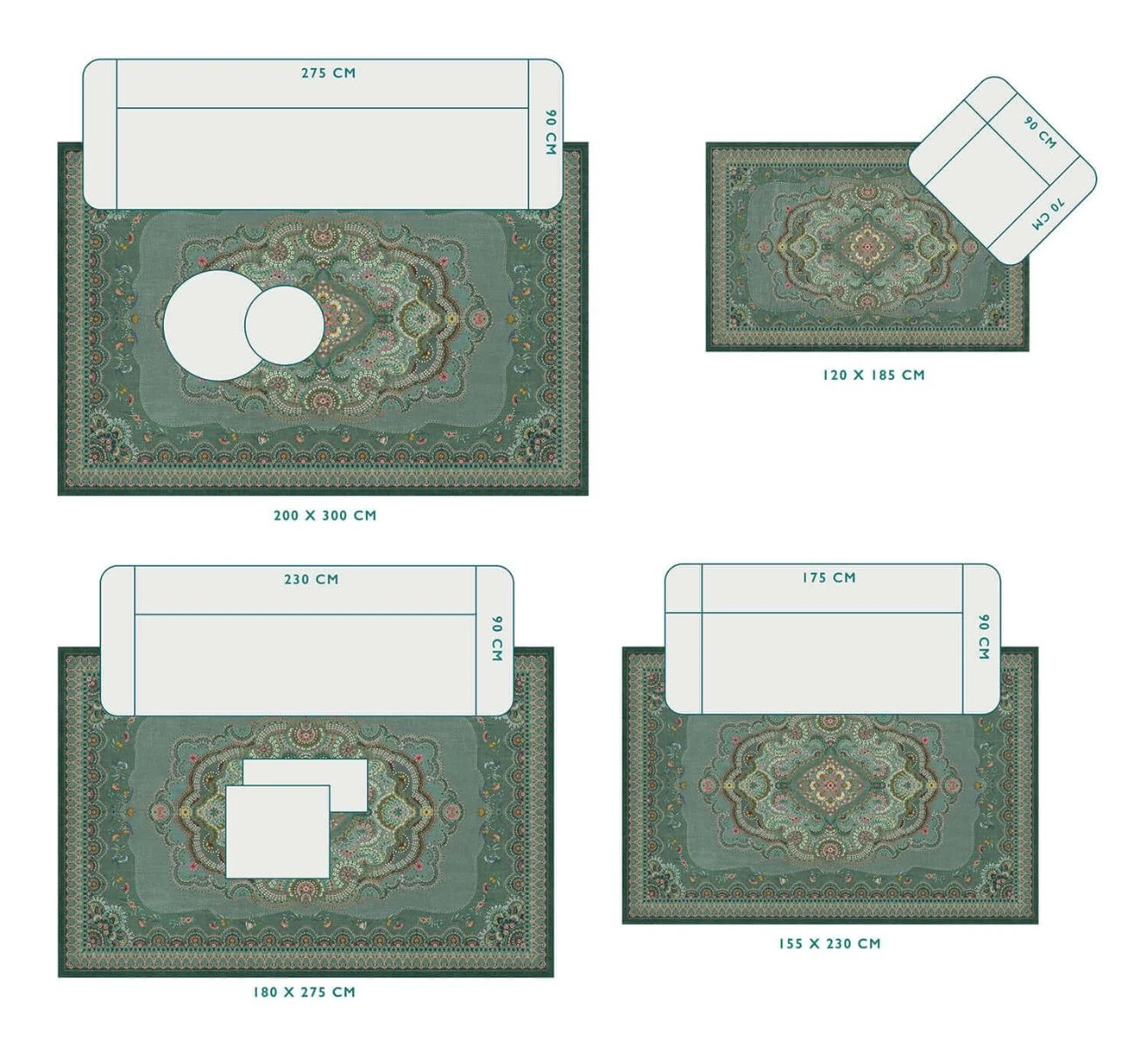 - Available in sizes: XS = 120×185 cm, S = 155×230 cm, M = 185×275 cm en L = 200×300 cm