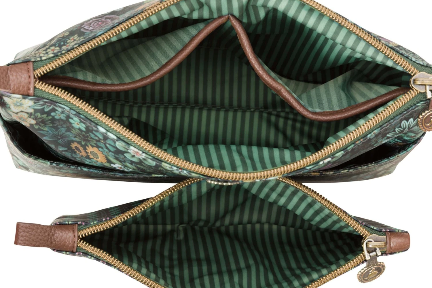 With this green toiletry bag from the Tutti I Fiori collection you always have your favourite beauty products within reach. The toiletry bag is decorated with a unique variation of imaginative small flowers and has a clover pattern at the bottom. The toiletry bag has a large compartment and several small compartments and is finished on the inside with a design of stylized arches.