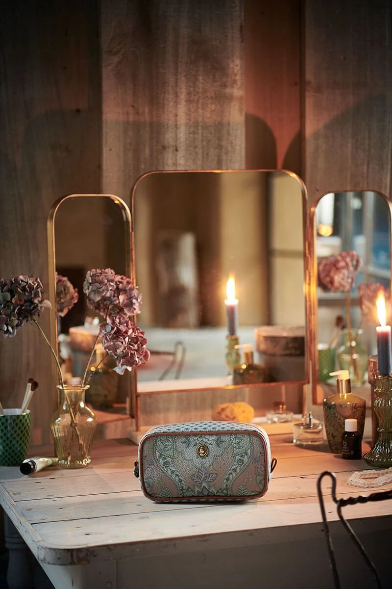 With this small toiletry bag from the Kyoto Festival collection you always have your favourite beauty products within reach. The toiletry bag is decorated with a unique variation of imaginative chintz flowers and leaves and has a design of stylized arches at the top. The toiletry bag has a large compartment and a small compartment and is finished on the inside with a design of stylized arches.