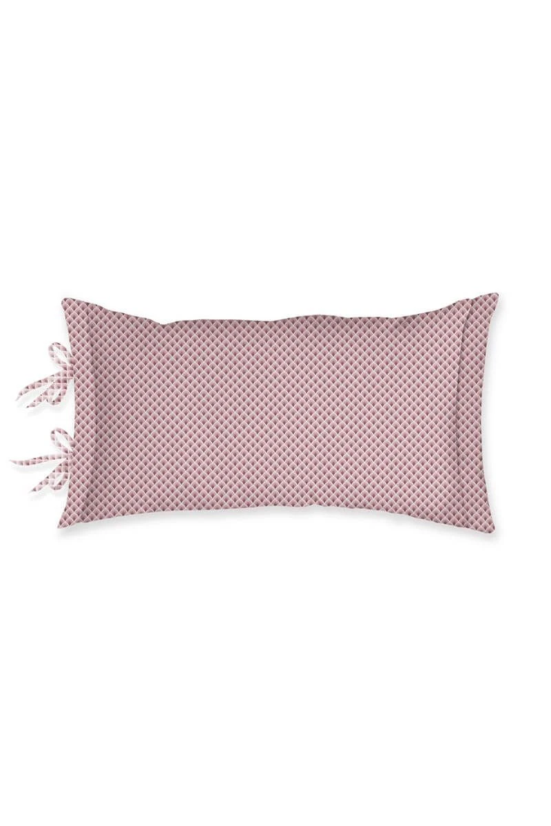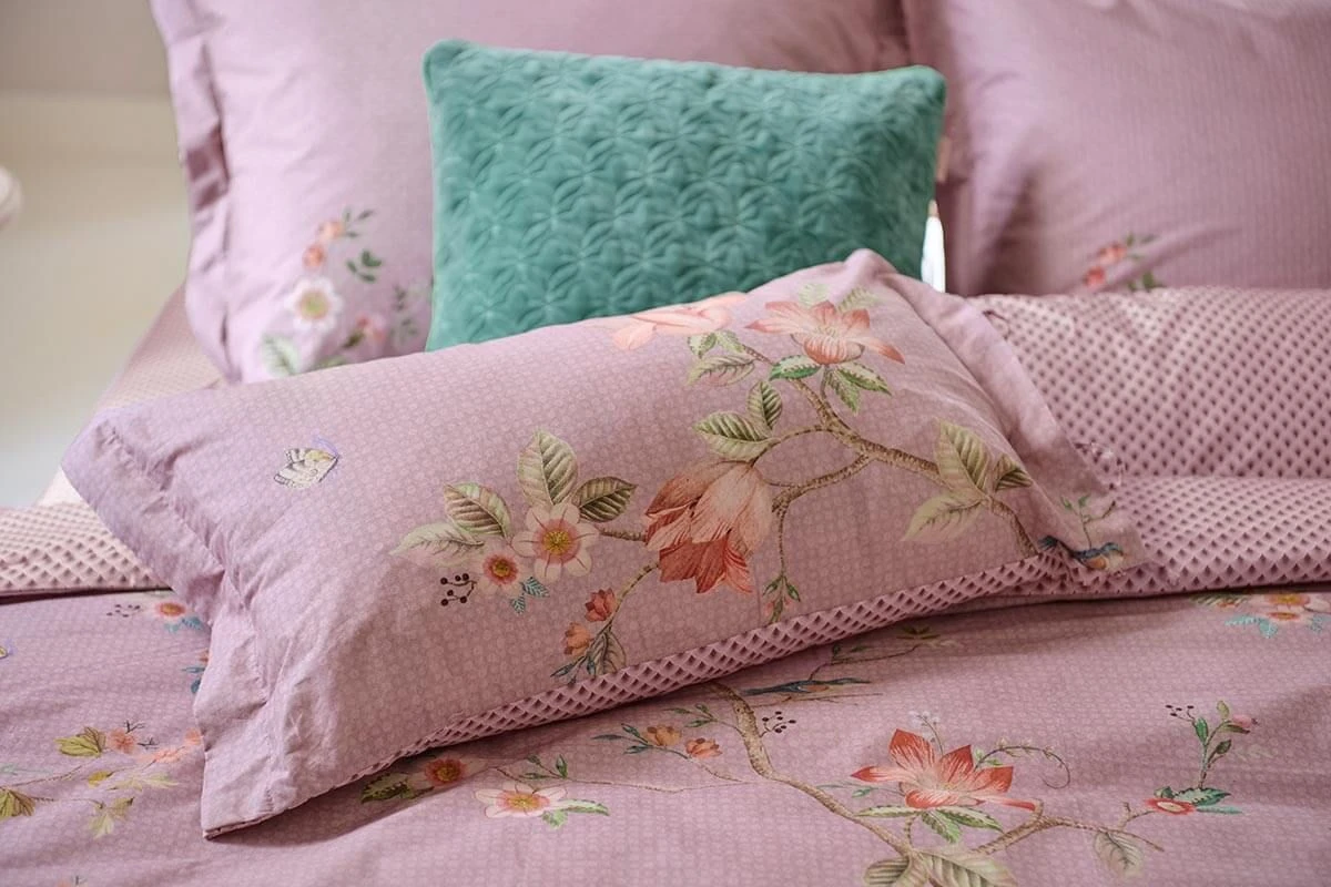 The romantic lilac Okinawa decorative pillow is inspired by Oriental Chinoiserie prints. Graceful peacocks stand jauntily loving in a landscape of Japanese blossom trees and oriental fruit trees. Beautiful flowers, exotic fruits and small ornamental berries grow on the branches. The back has a pattern of small arches. Both sides of the decorative pillow have a tile print. This gives the Okinawa pillow together with the bow tie a rich look. You can use the pillow on both sides. The Okinawa pillow is available in several colors.