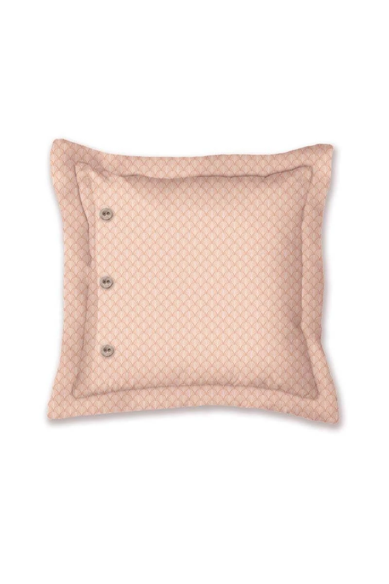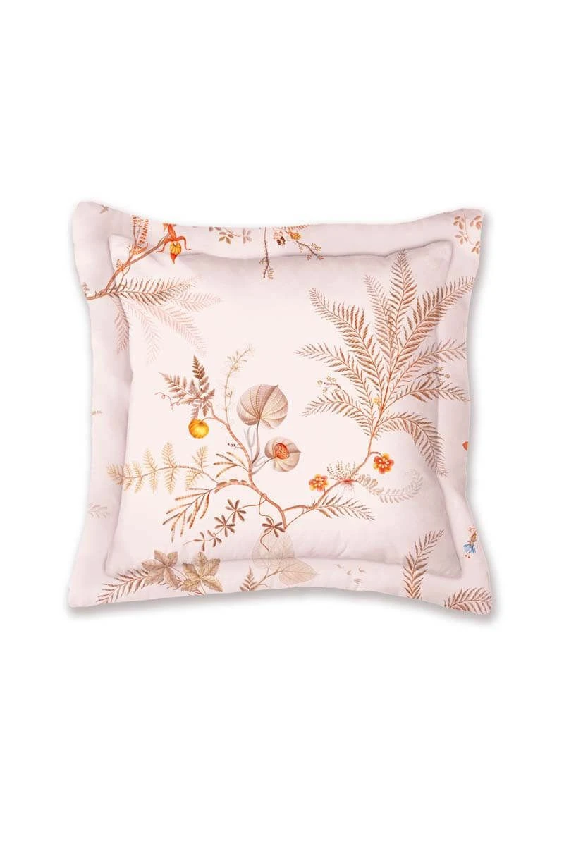 The square Salento cushion features swaying palm trees and ferns with silhouetted leaves in the background. The back has a pattern of stylised shells. The decorative cushion has a quilted Oxford border on the sides, giving it a luxurious look. You can use the cushion on both sides, creating a playful mix & match effect on your bed.