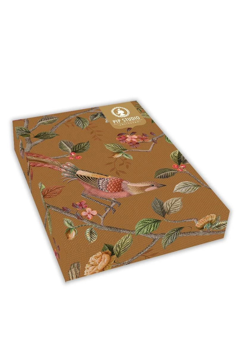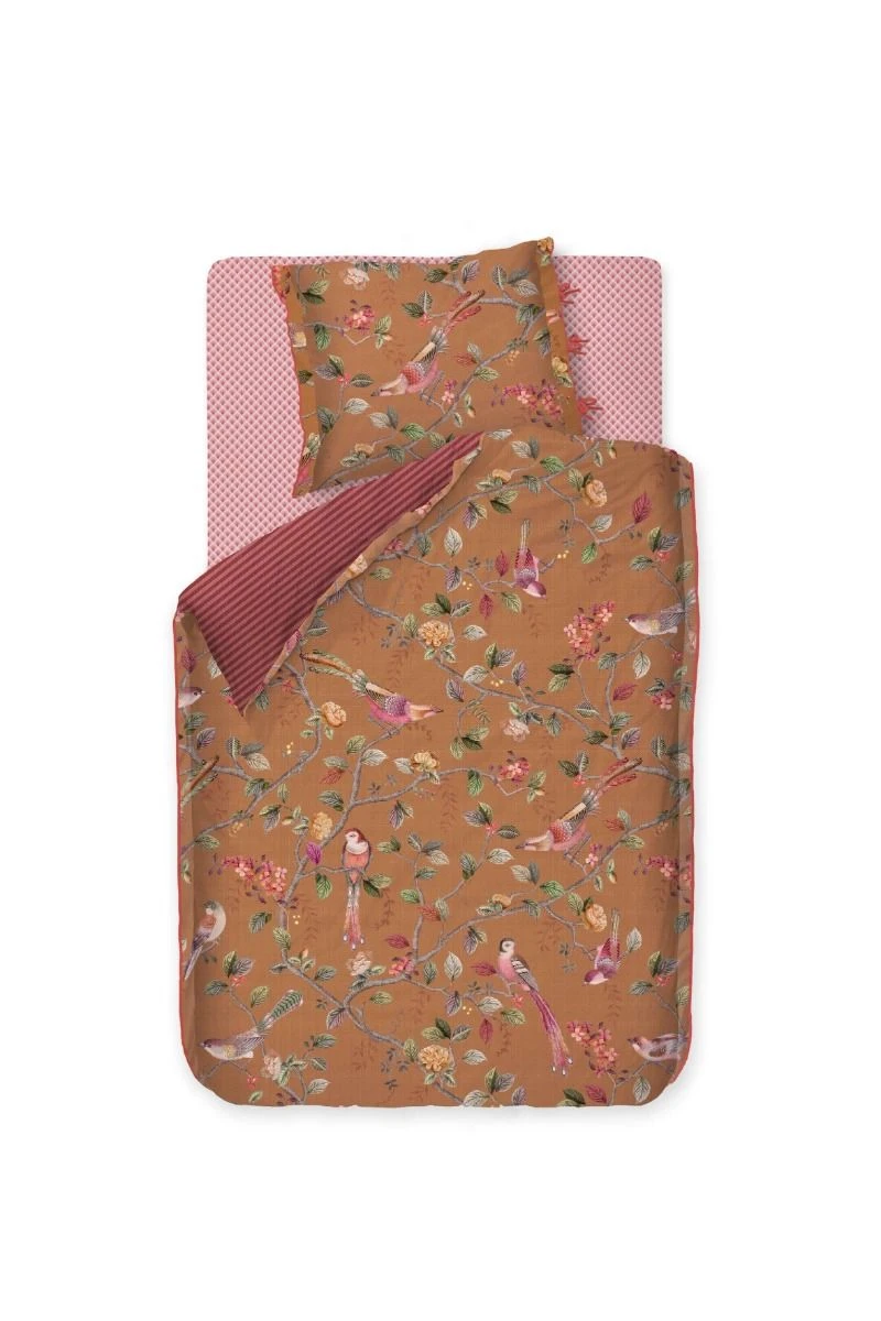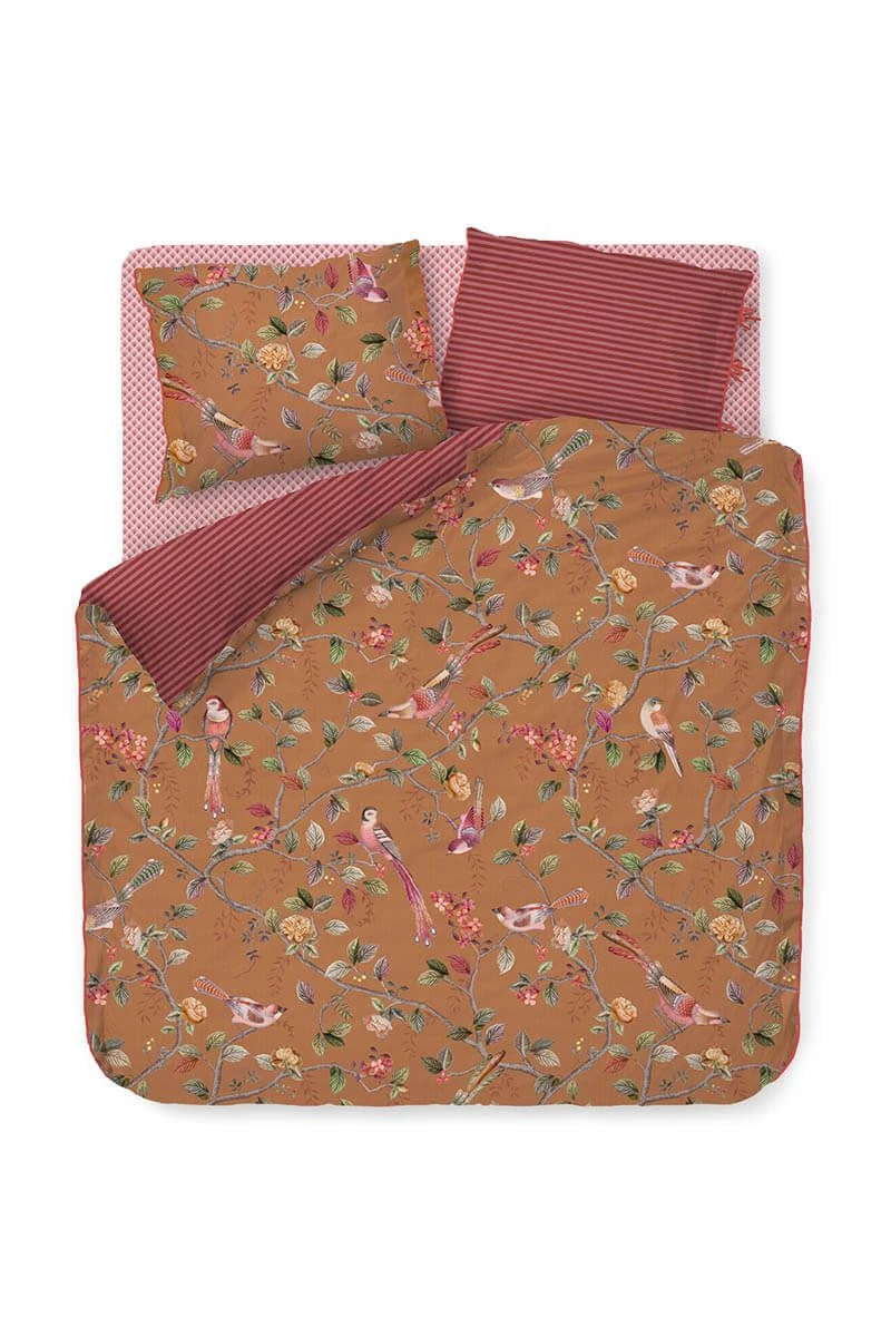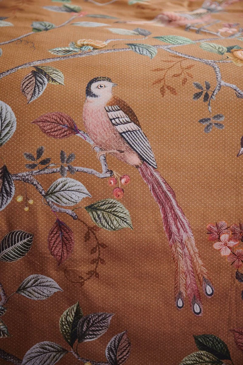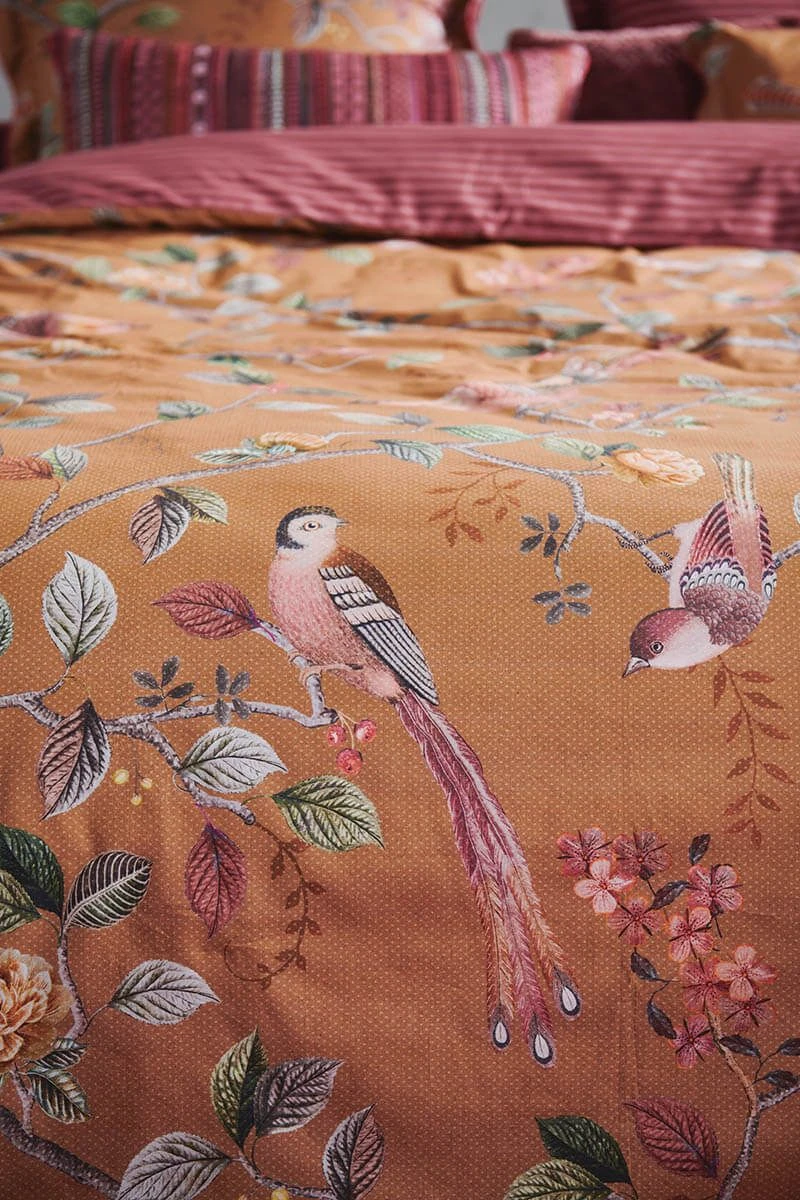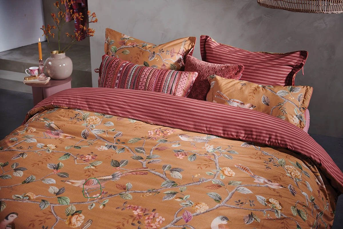 This yellow duvet cover is printed with the Good Nightingale design. this prints consists of flowers branches and several kinds of flowers and birds. It consists a quilted edge, tie closure and is finished with a coloured trim. The other side is red, printed with a striped pattern. This allows the duvet cover to be used on both sides.