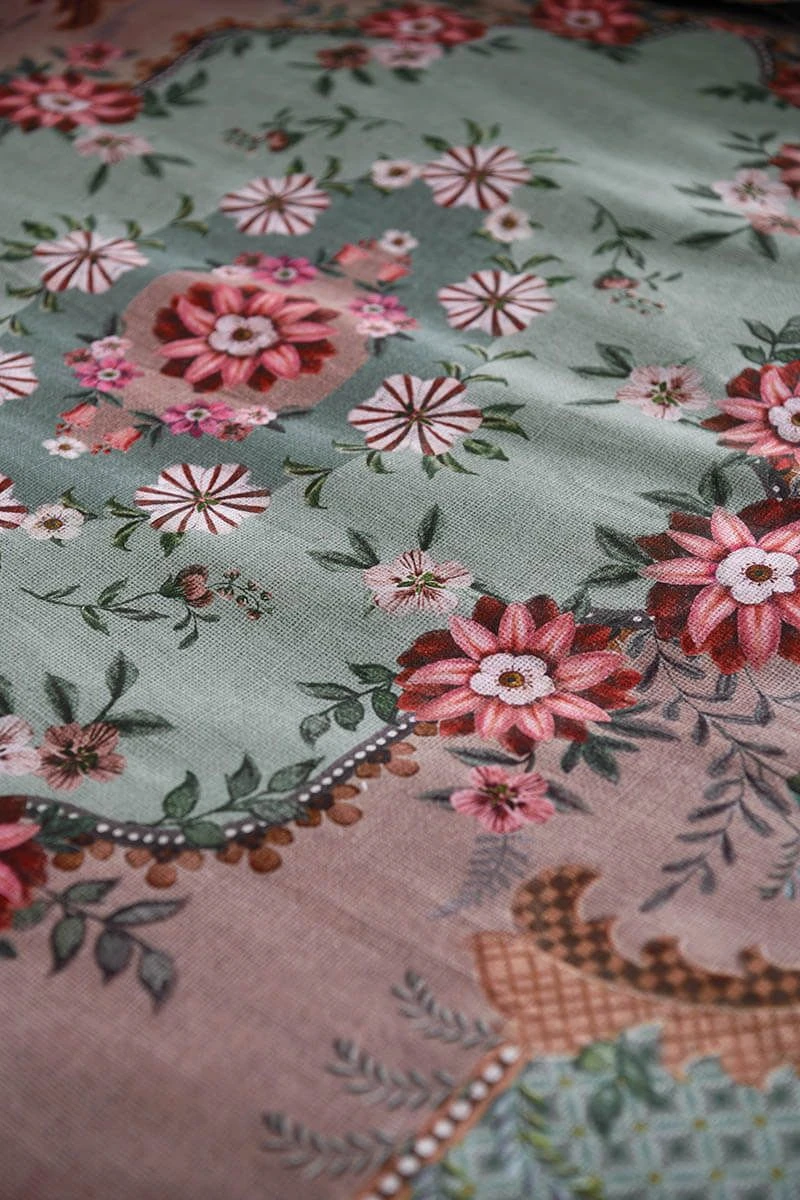This beautiful green duvet cover is decorated with the Pip Chique design. This print is inspired by classical carpets and consist rosettes, fantasy flowers and a variety of arches, checks and vertical stripes. The duvet has an oxford edge and tie closure. The back is printed with a striped design, so the duvet can be used on both sides.
