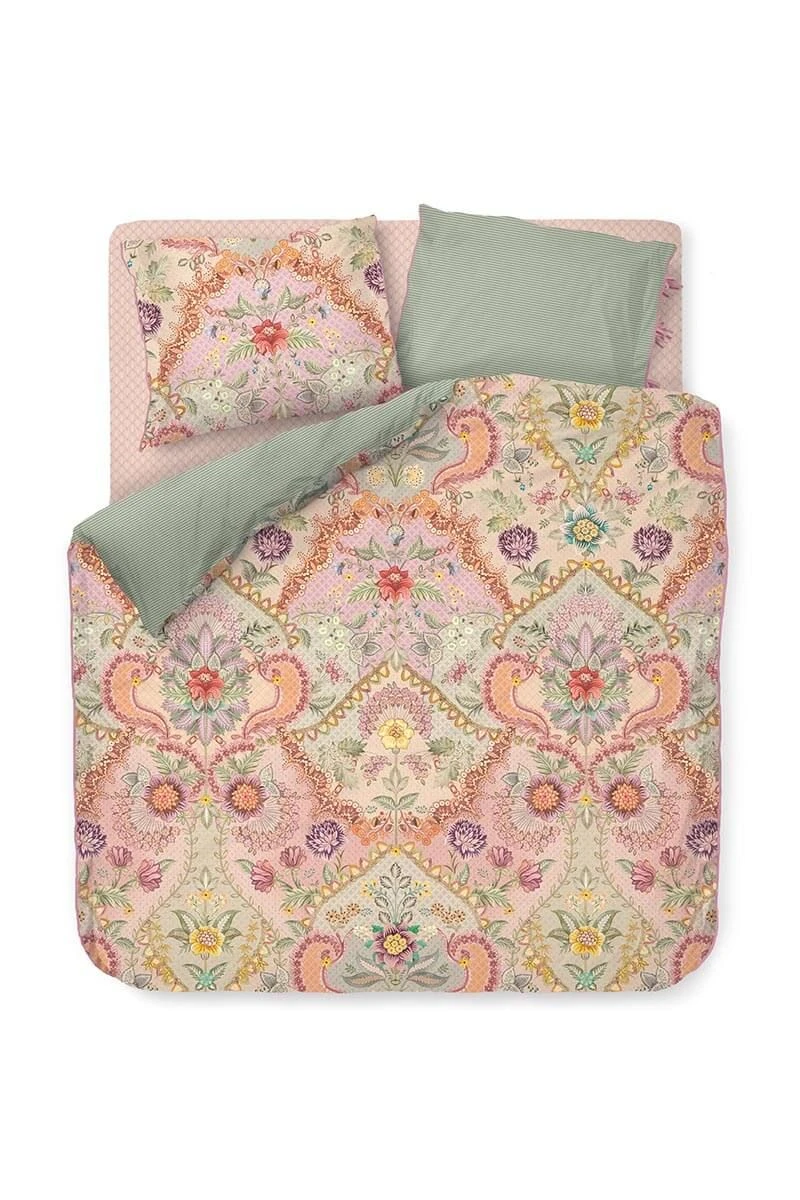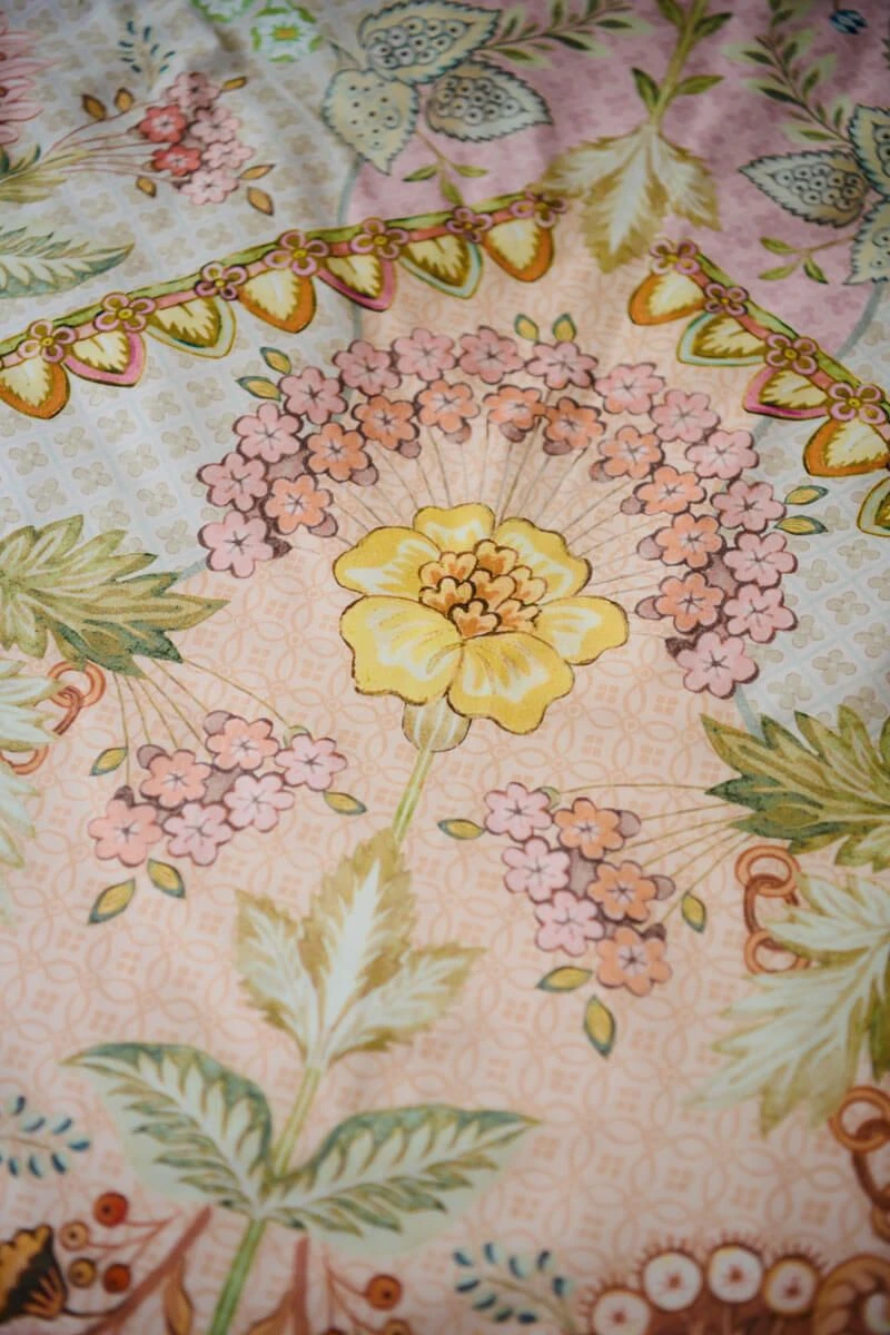 The pastel Saluti Grandi duvet cover is a symmetrically constructed floral pattern inspired by the beautiful wallpaper motifs from Italy. The back has a pattern of stripes. The cover and pillowcases have a quilted oxford border on the sides, giving a luxurious look. The pillowcases have a bow closure and just like the duvet cover have two different sides and can be used on both sides. This way you create a playful mix & match effect.