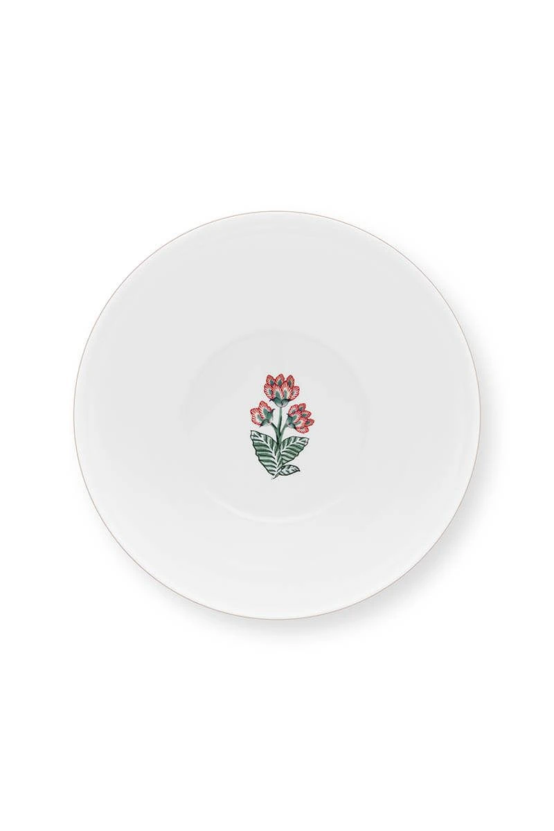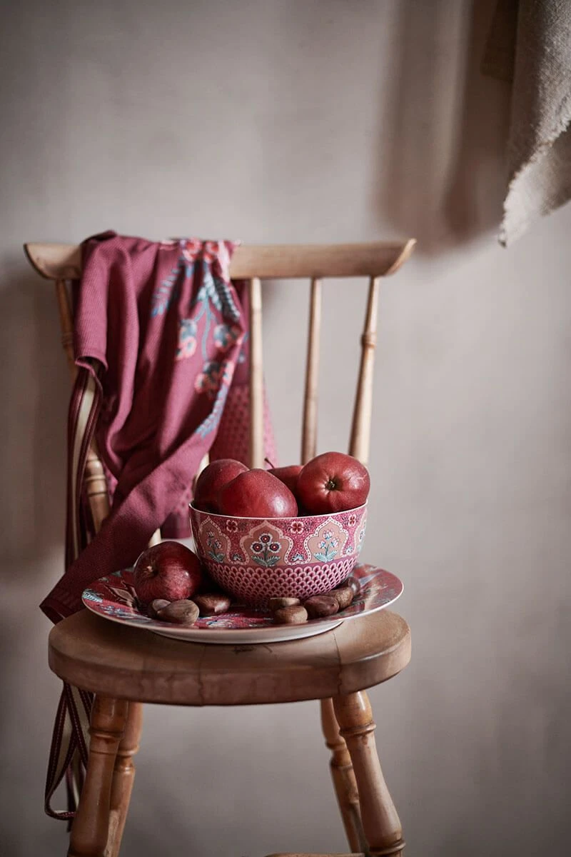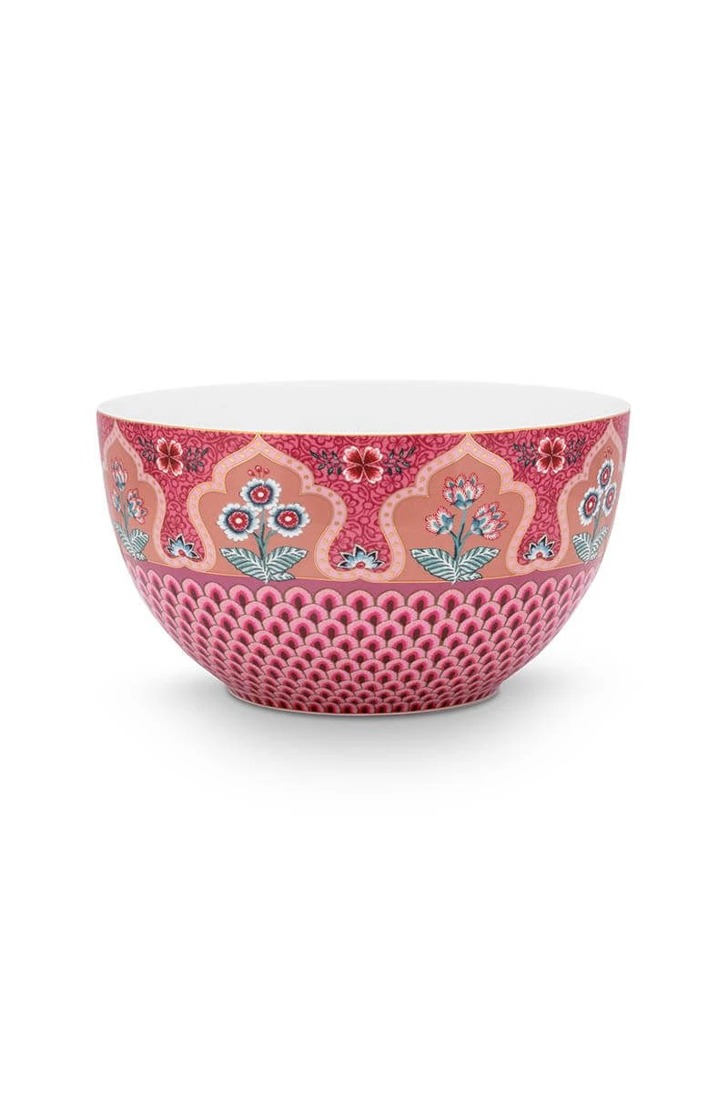 Brighten up your table with this bowl from the Flower Festival collection . The bowl has a floral design with imaginative red and pink chintz flowers with light blue and green leaves combined with a scallop design.