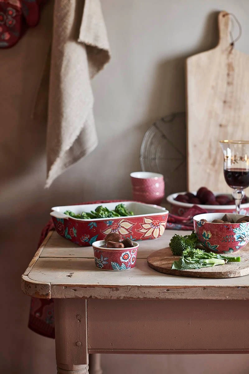 Bake your dishes in this cheerful baking dish from the Flower Festival collection . The baking dish has a floral design with imaginative red and pink chintz flowers with light blue and green leaves.