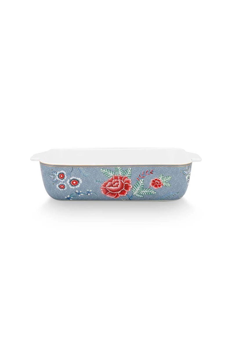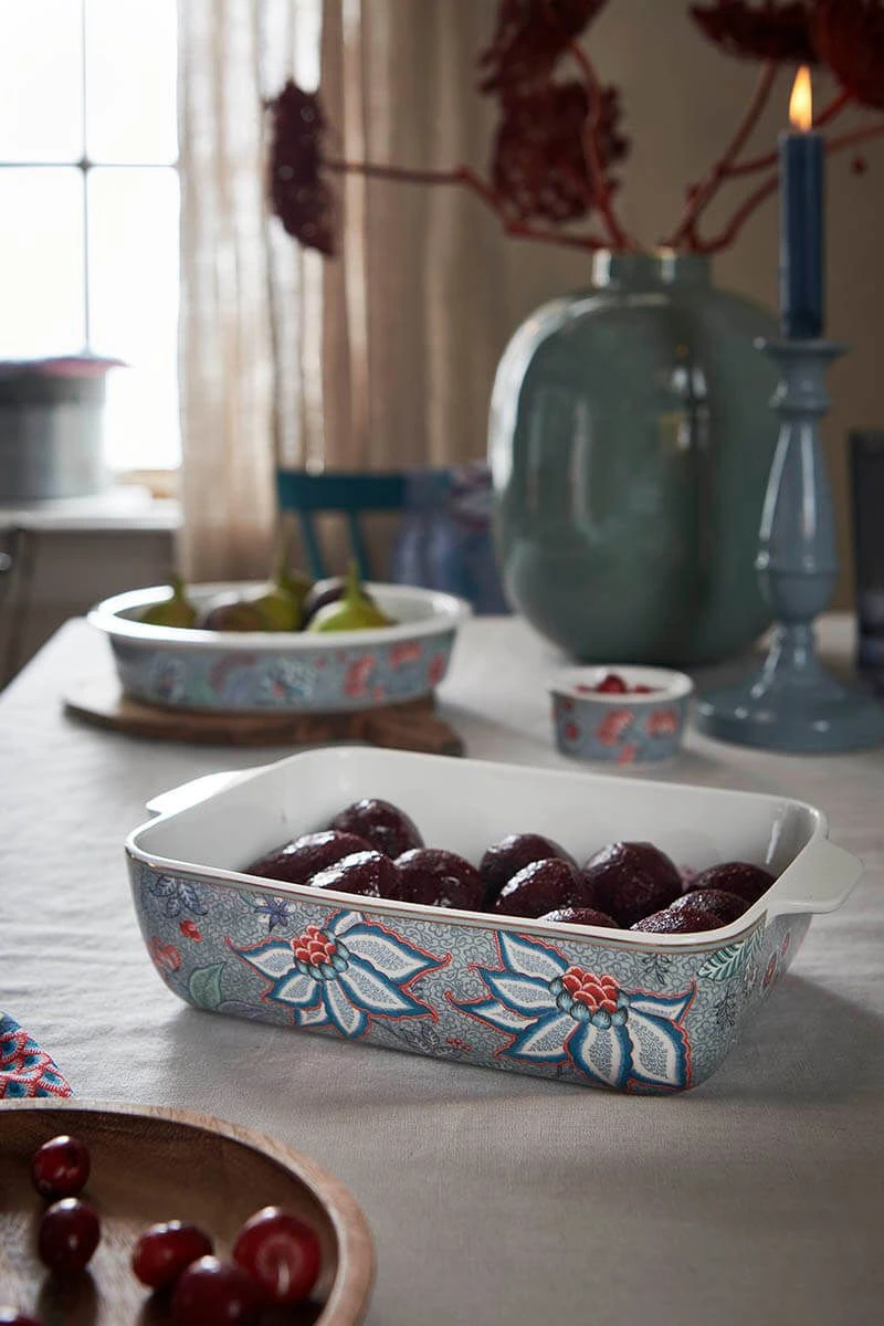 Bake your dishes in this cheerful baking dish from the Flower Festival collection . The baking dish has a floral design with imaginative red and pink chintz flowers with light blue and green leaves.