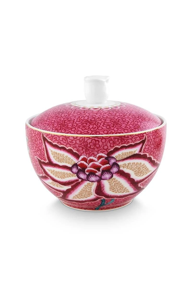 This charming sugar bowl is perfect for those with a passion for porcelain. The round sugar bowl is decorated with the cheerful Flower Festival design. This rich floral pattern features a variety of fanciful red and pink chintz flowers with light blue and green leaves.