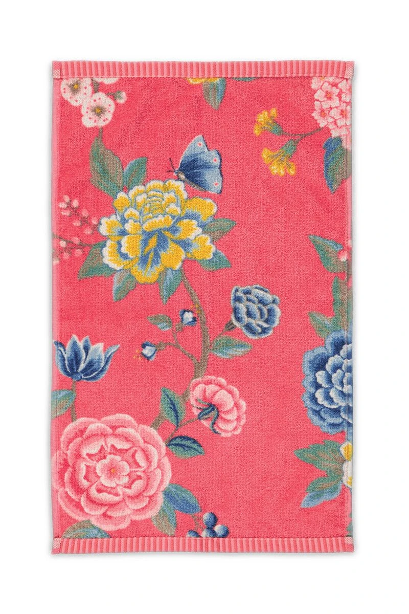Refresh your bath linen stack with the coral Good Evening guest towels. The Good Evening Guest Towels feature a print of elegantly drawn oriental flowers. A bird and a butterfly flit among the blossoms. The guest towels have a coral-striped trim. The print includes the colours yellow, blue, green, pink red, and white. The Good Evening bath linen series pair beautifully with the other series by Pip Studio, which creates a lovely mix-and-match effect in your bathroom.