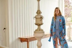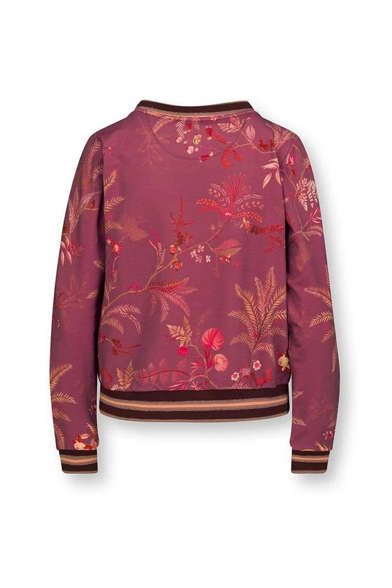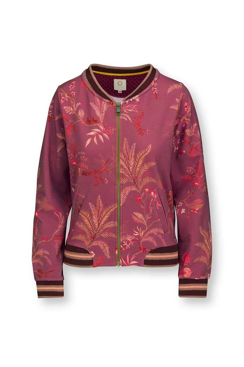 This pink jacket features the playful Isola design. The print is made up of a refined print of multi-colored twigs and ferns. The trims are decorated with blue and white stripes with glitter.