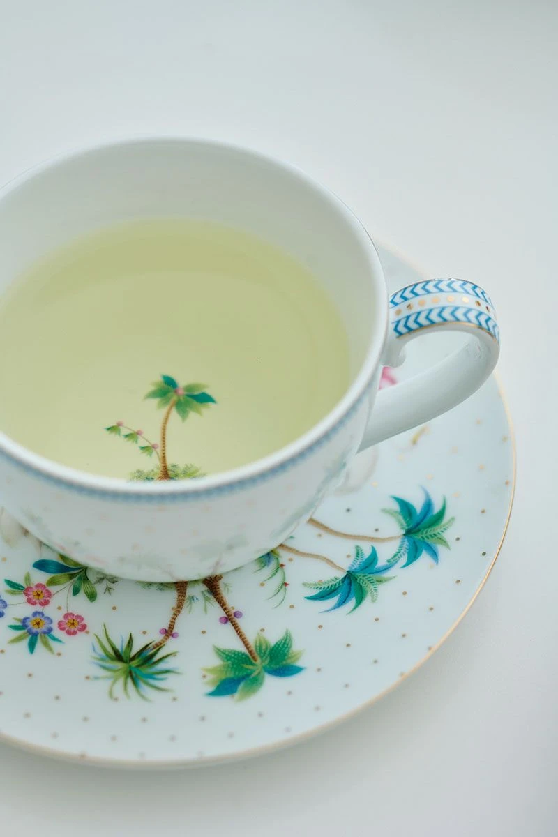 A perfect cup for all you hot drinks. This Jolie Cup & Saucer gives you a festive and tropical vibe because of its beautiful decoration. On the white background you will find golden dots and a golden detail on the edge. Furthermore the cup is decorated with palms, colourful flowers and exotic species. The handle of the cup is decorated with blue details, which fit in with the tropical vibes perfectly.