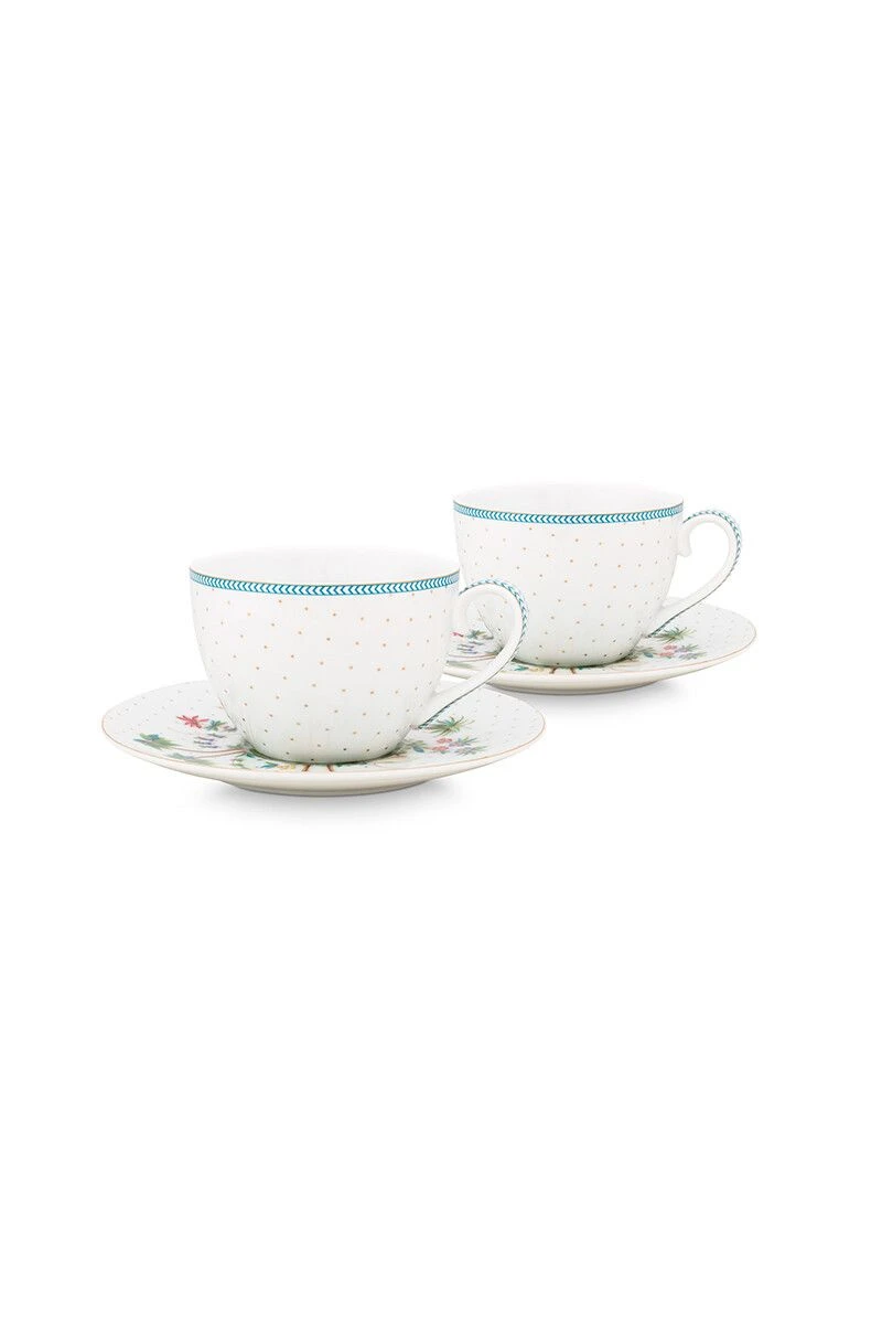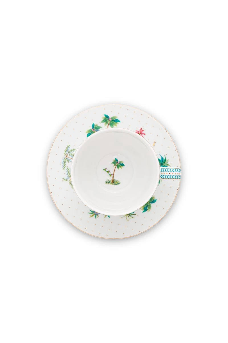 This white cup & saucer set will take you on a trip to a trpoical island with its tropical design. The cups are decorated with an exotic design. The saucers are decorated with golden dots and have blue details.You will find various plants, colorful flowers an species in here. This set has te perfect size for a delicious cup of coffee.