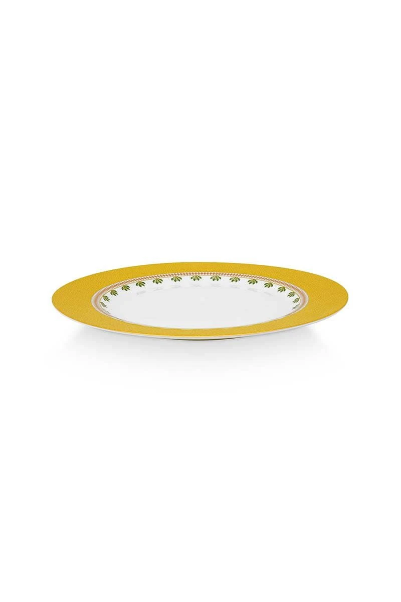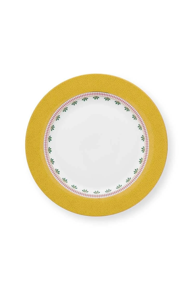 This dinner plate is decorated with a yellow design and golden details. Combines beautifully with other items from the La Majorelle collection.