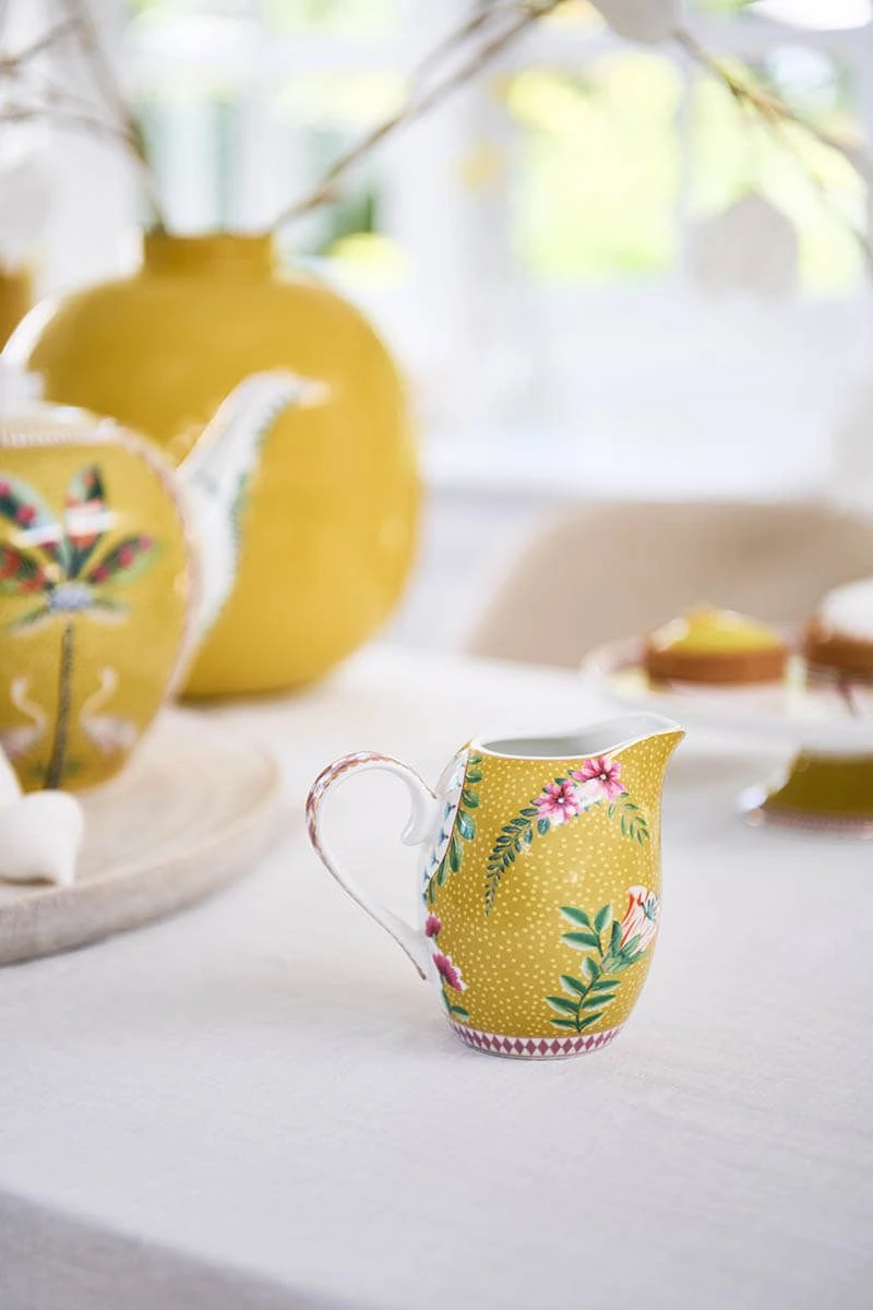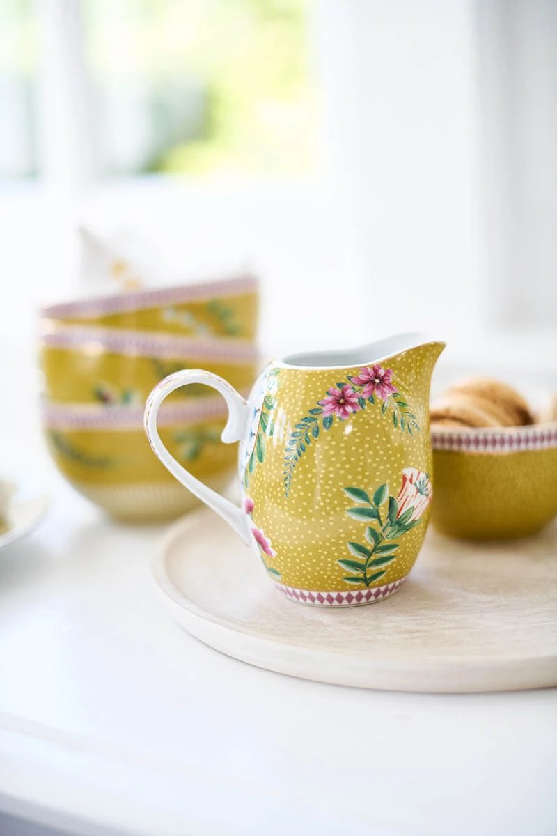 This charming milk jug is perfect for coffee & tea lovers. Pour in style with the yellow milk jug, decorated with the cheerful La Majorelle design. This design features small stylised flower branches with different varieties of exotic flowers. Cheerful pink details give the milk jug a cheerful twist. Our La Majorelle porcelain will make your china cabinet and table shine!