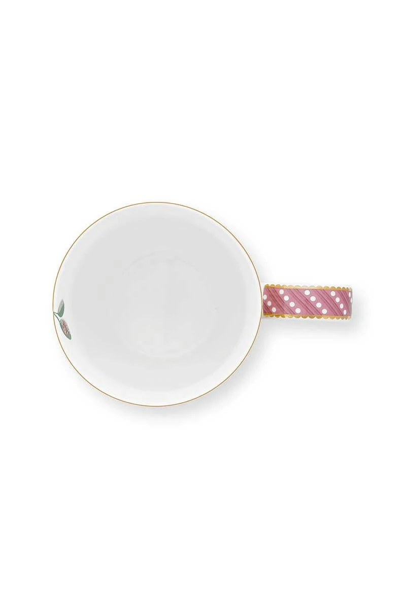Enjoy a cup of hot coffee or tea from this La Majorelle extra large yellow mug. The mug is decorated with an exotic palm tree with a white heron strutting alongside it against a white and yellow striped background. The handle of the mug is adorned with a white edge decorated with pink details that give the mug a luxurious look and feel. Our La Majorelle porcelain will make your china cabinet and table shine!
