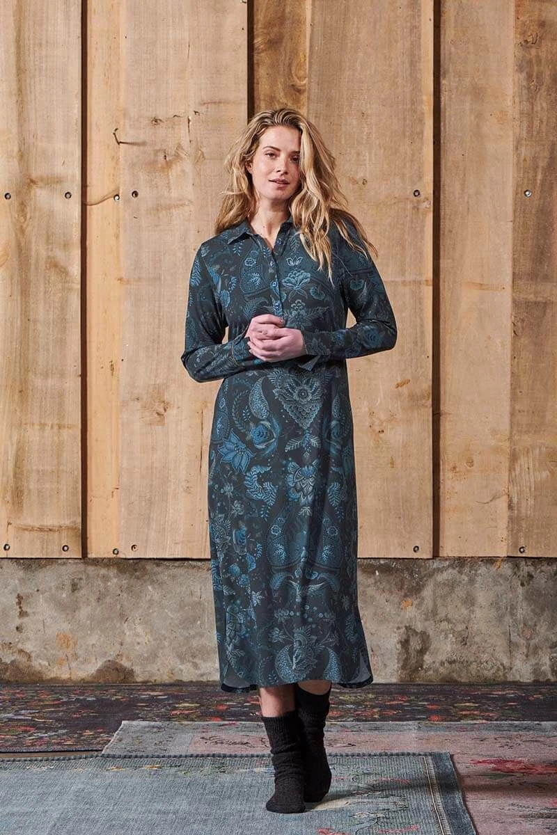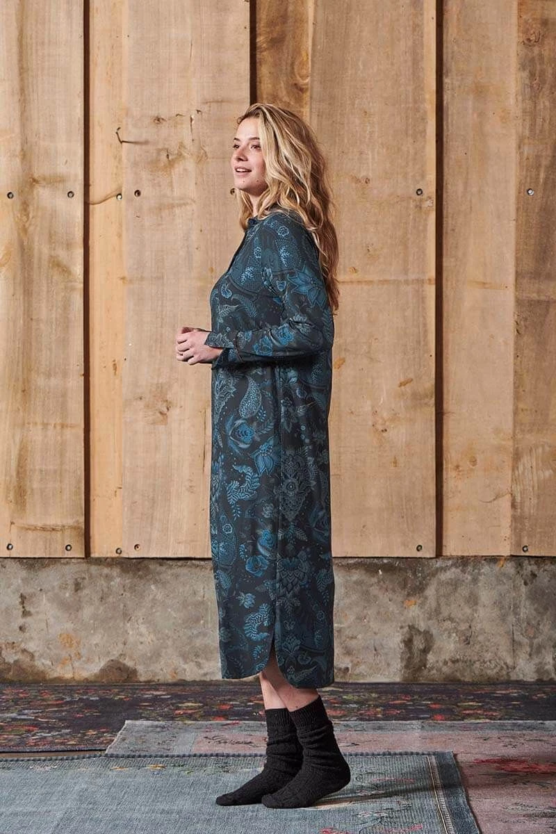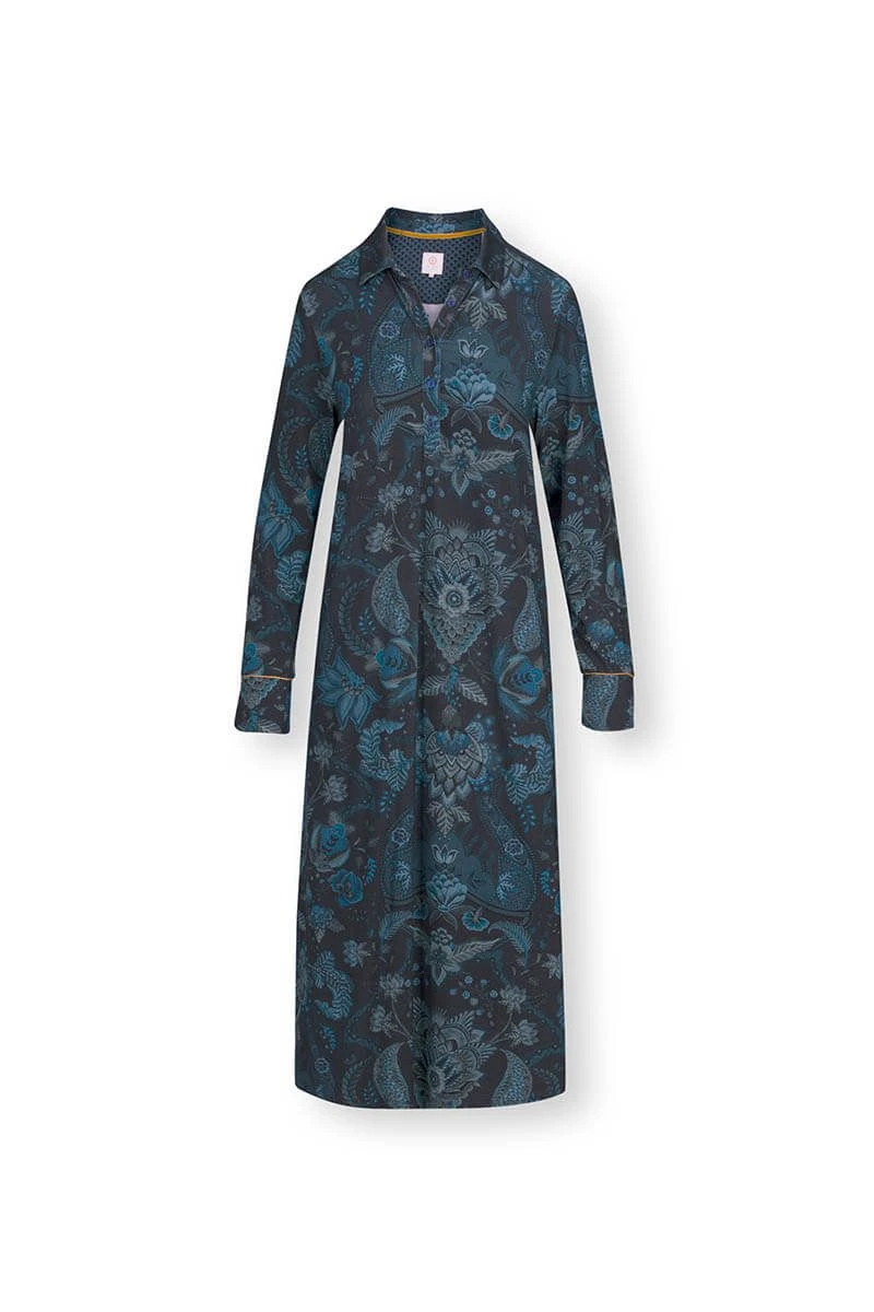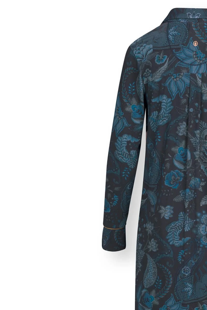 This nightdress in dark blue is decorated with the cheerful Kyoto Festival design. The repeated floral design is made up of a variation of imaginative chintz flowers and leaves. The nightdress has a collared neckline with matching buttons.