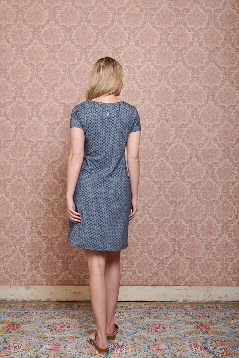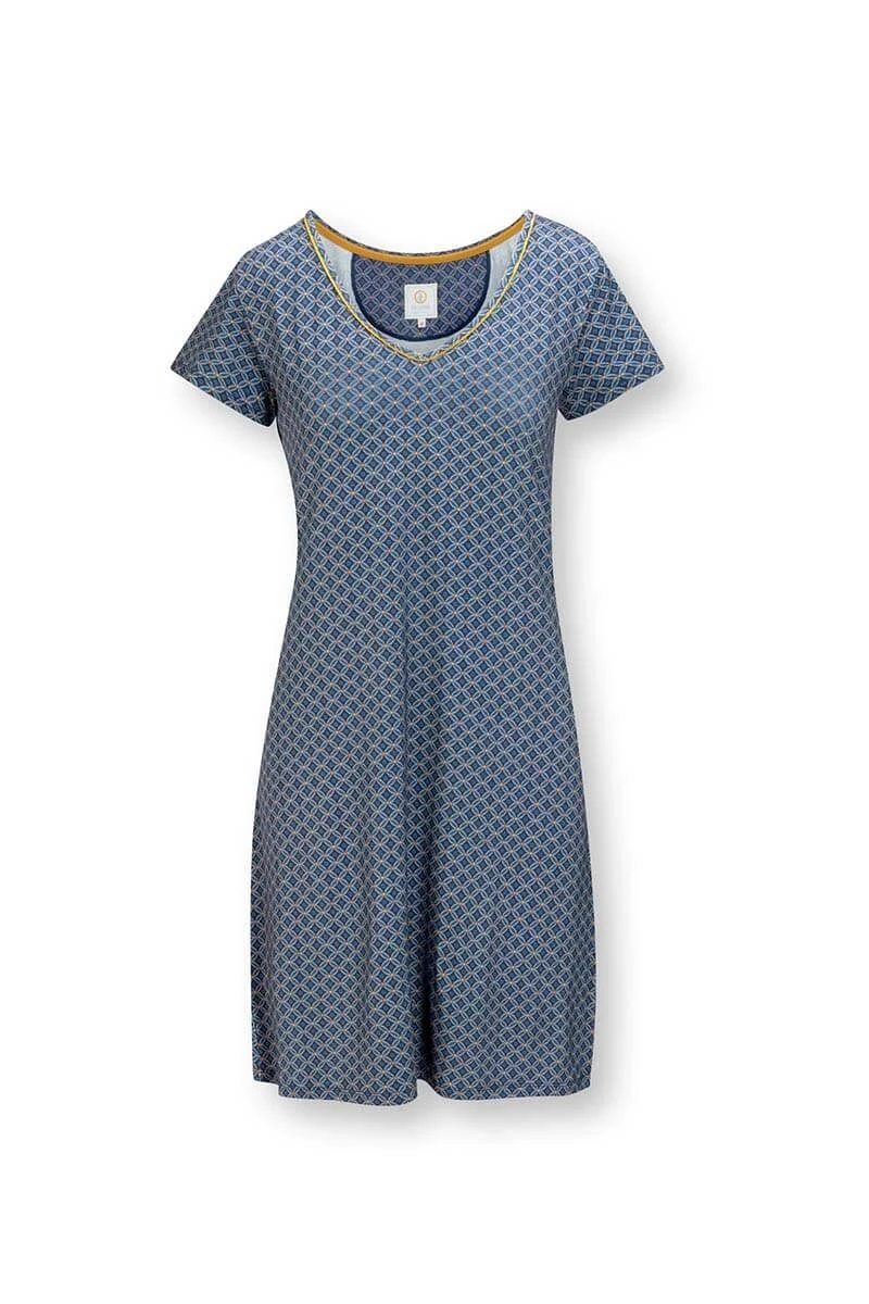 This blue nightdress is decorated with the organic Tegola design. The print consists of a variation of circles with a playful color difference. The nightdress has short sleeves.