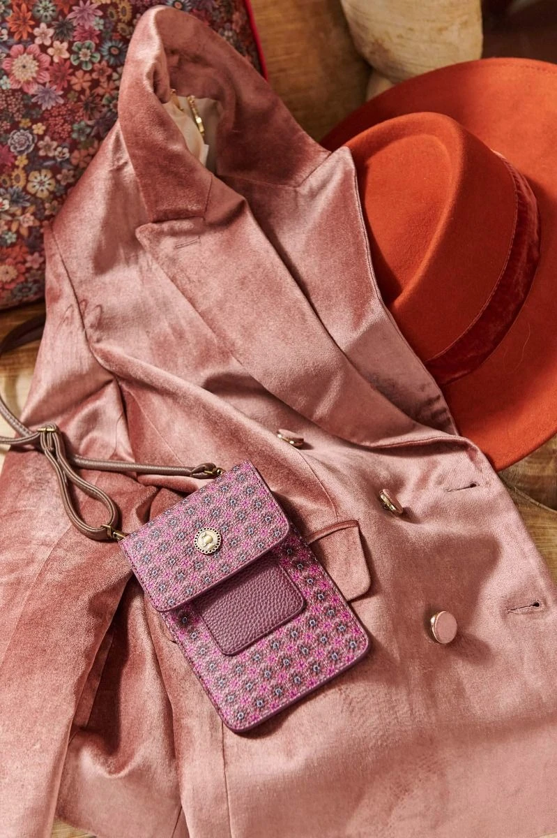 Take your phone with you in style with this pink phone bag from the Clover collection. The phone bag is decorated with a repeated design of stylized clovers and has enough space for a phone and your most important card.
