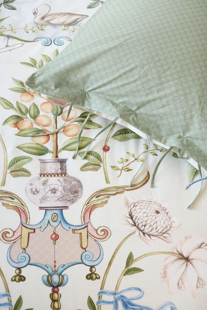 The white Fest di Lividonia pillowcase reminds you of a beautiful mural from a stately Italian country house. The back has a pattern with shells. The pillowcase has a quilted oxford border on the sides, this gives a luxurious look. The pillowcase can be used on both sides.