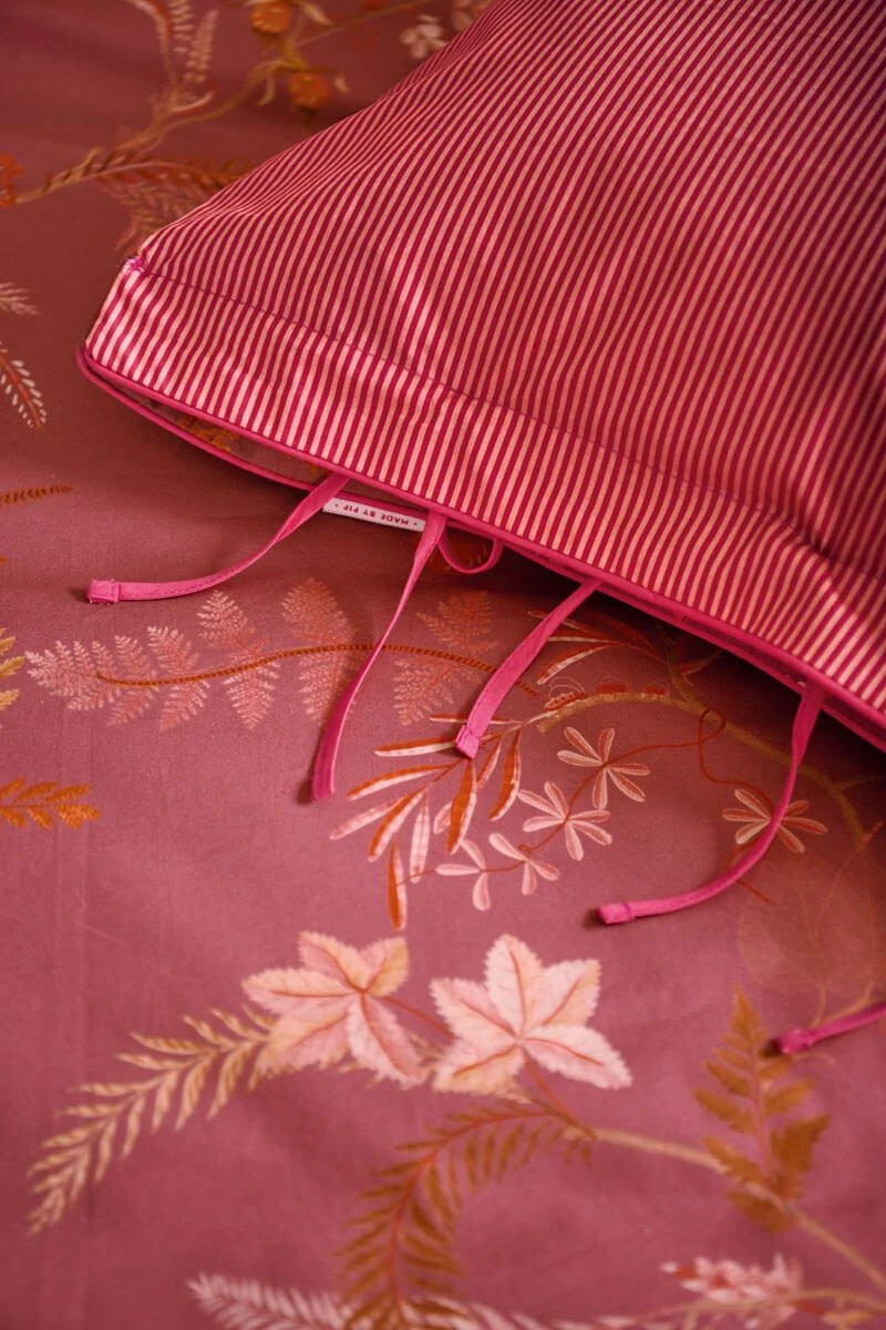The pink Isola pillowcase owes its distinct character to a tonal print of detailed palm trees and ferns in different colorful stripes. The back has horizontal red and pink stripes. The pillowcase has a quilted oxford border on the sides with a unique bow closure, giving it a luxurious look. The pillowcase can be used on both sides.