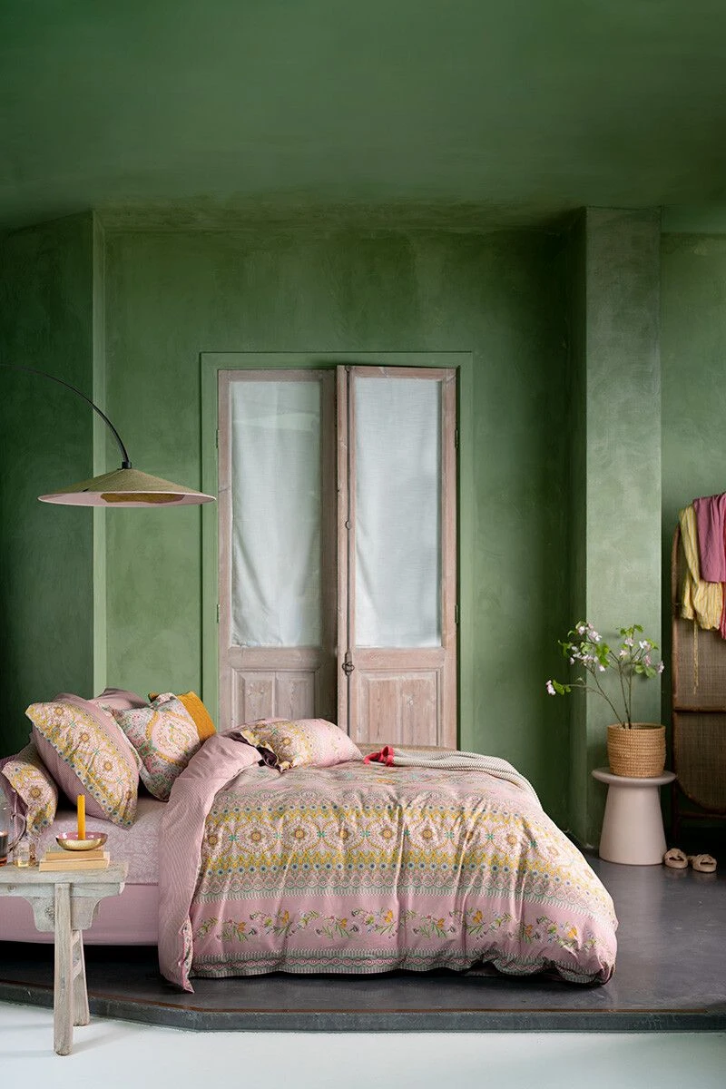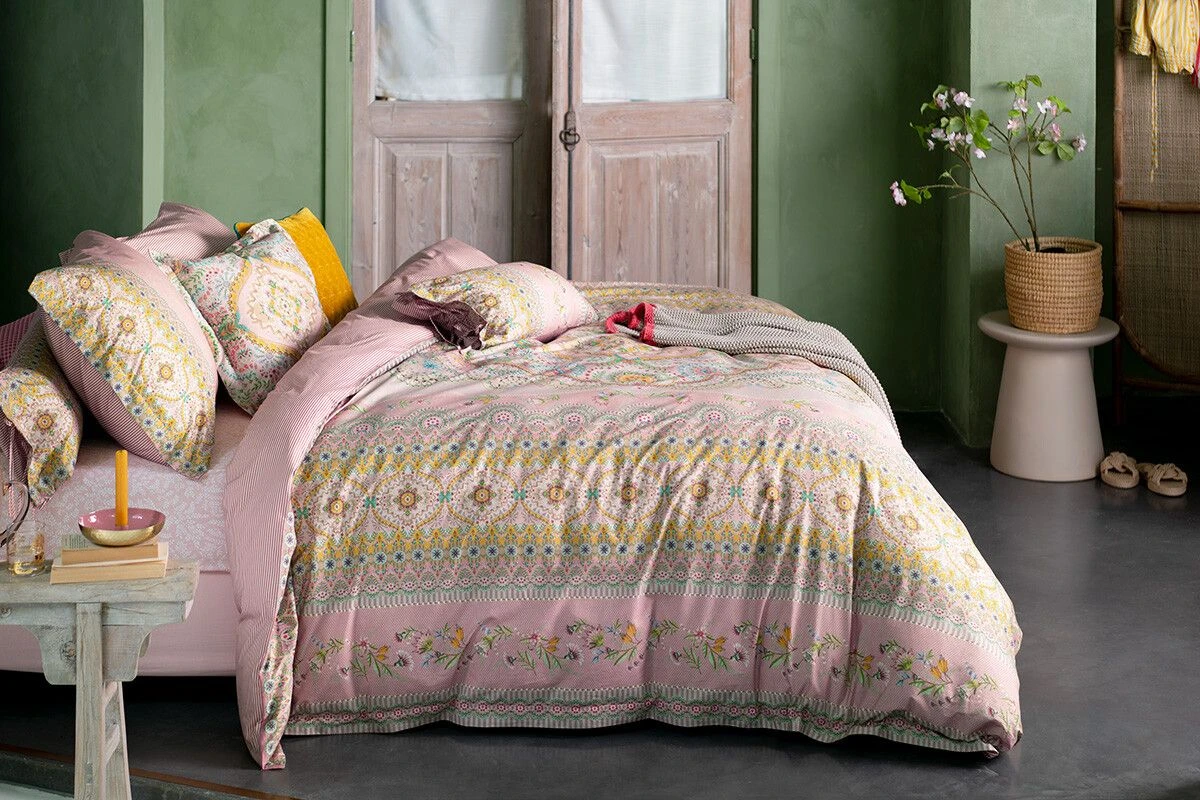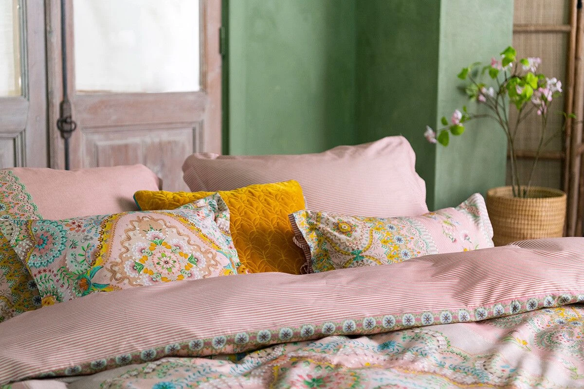 The unique Majorelle Carpet pink pillow case is inspired by our classic carpets. The print is made up of thousands of small flowers in paisley-like shapes that decorate the side of the pillow case. The background has a subtle printed linen texture, giving the pillow case the authentic look and feel of a woven carpet.