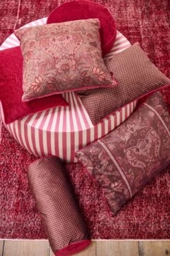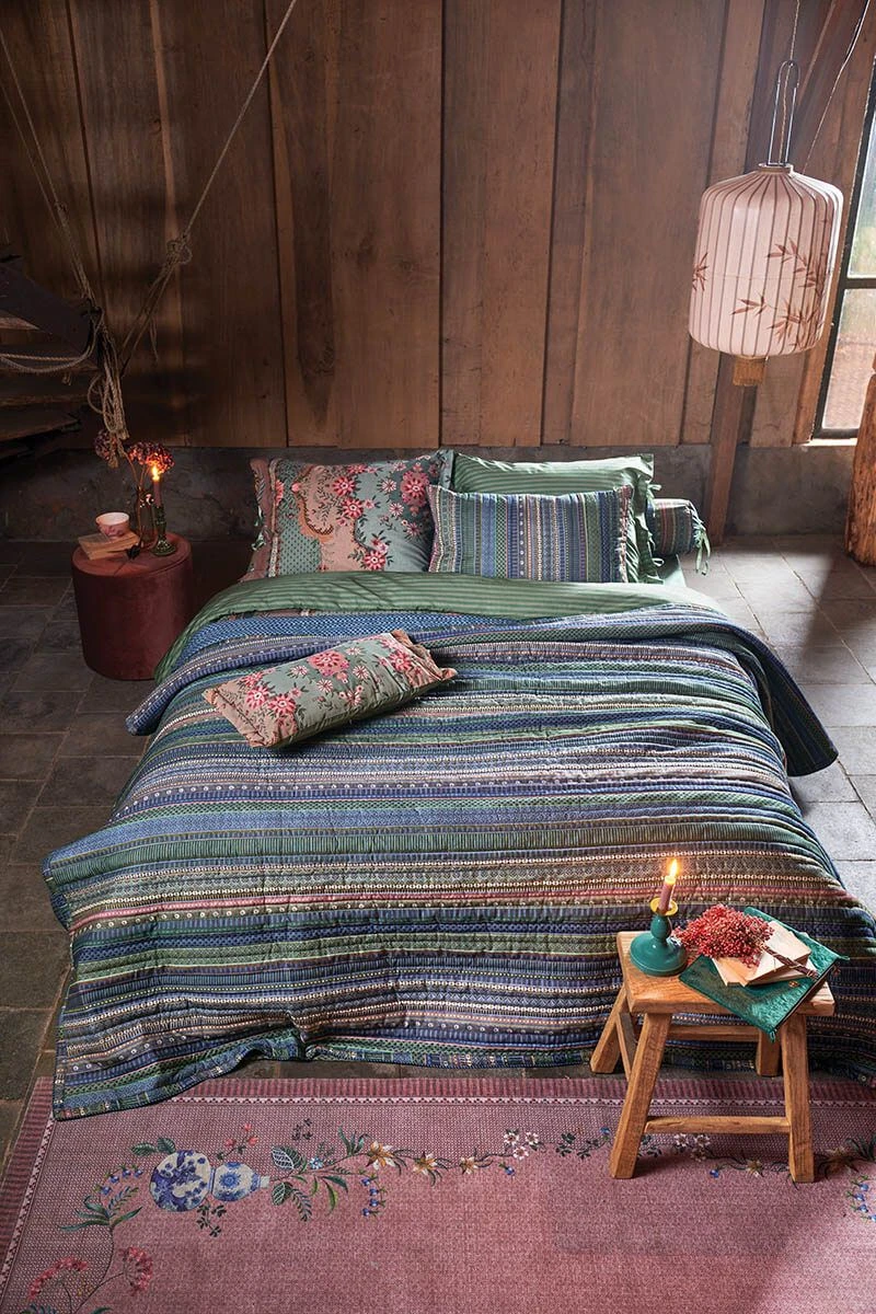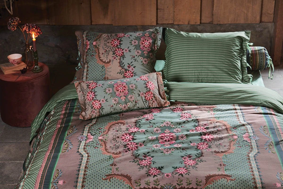 This pillowcase in green is decorated with the Pip Chique design. This print is inspired by classic carpets and features rosettes, fantasy flowers and a variation of bows, checks and stripes. The case has an Oxford edge and striped piping on the sides, as well as a unique tie closure in accent colours. The back is printed with a stylized striped print, this allows the pillow to be useable on both sides.