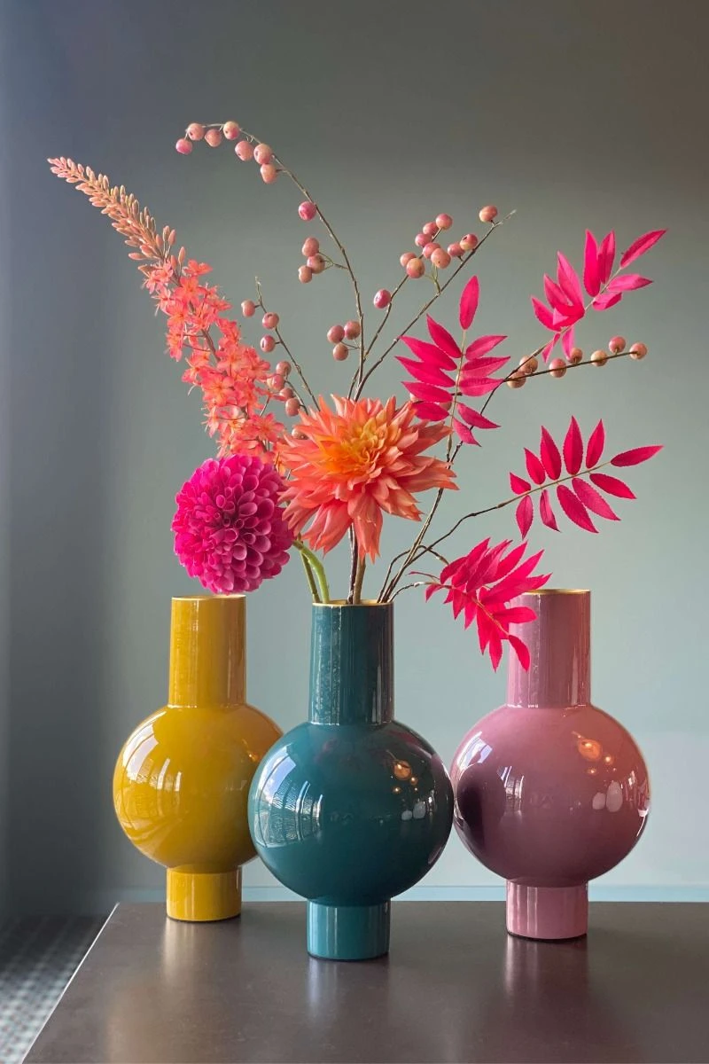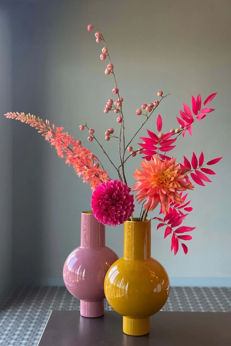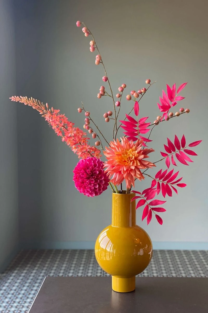 This beautiful new bouquet Sweet Symphony will make your home shine this summer! The beautiful fuchsia pink hues perfectly match a soft pink Pip Studio vase, making the artificial bouquet stand out even more. The apple branch in red adds a unique twist to this bouquet.
