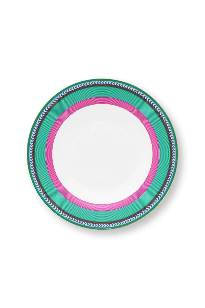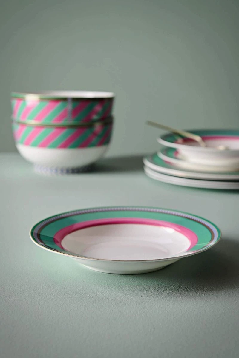 This deep plate has a pink and green striped design with a white background in the centre. The plate is finished with golden details and blue and white diamond shapes and perfect to mix with the other plates of this collection or our Royal Stripes collection. The Porcelain is made of bone China, a high-quality thin porcelain with a sophisticated design. Also available in sizes: 23.5 cm, and 28 cm. Have a look at the full Pip Chique Stripes collection for more inspiration.