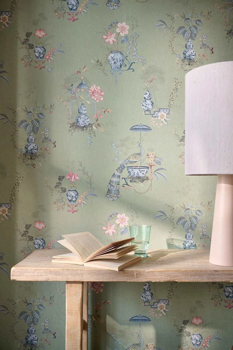 Give your home a magical make-over with this stunning Chinese Porcelain wallpaper in the colour light green. This design consists of small scenes in which porcelain vases play a leading role. The decorated vases are filled with elegant flowers and curly branches and surrounded by little gazebos with cranes, white herons and fanciful peacocks. The Saluti wallpaper is available in different colours: light blue, sand, mauve, dark green and dark blue. This design is printed on a non-woven surface with a vinyl top layer.