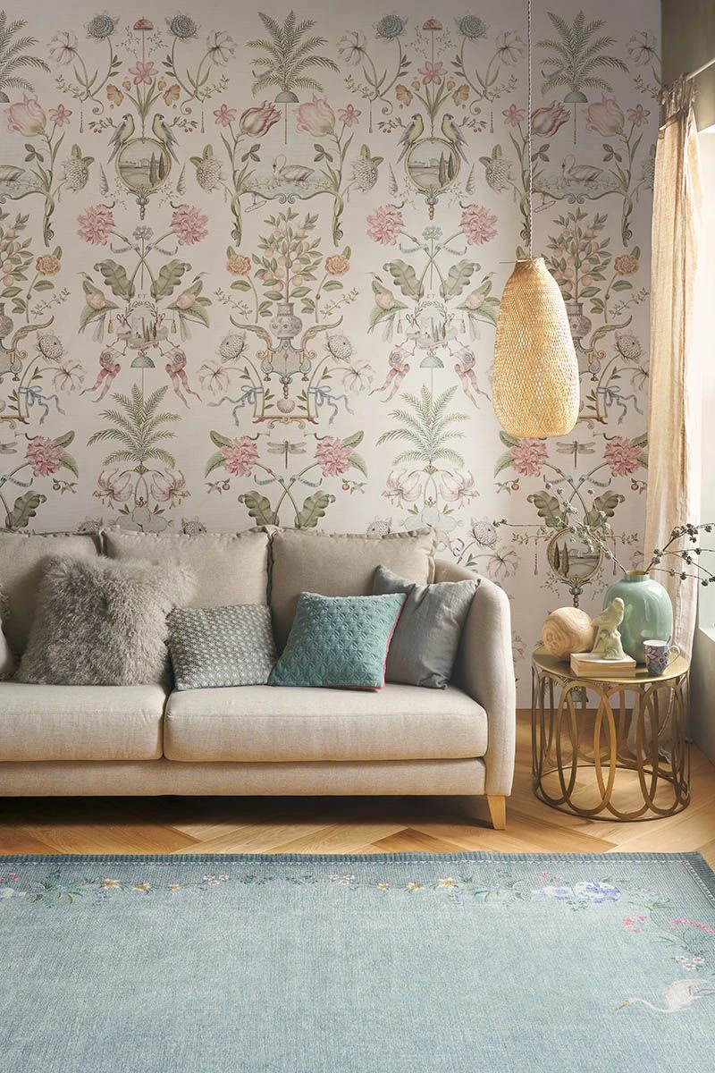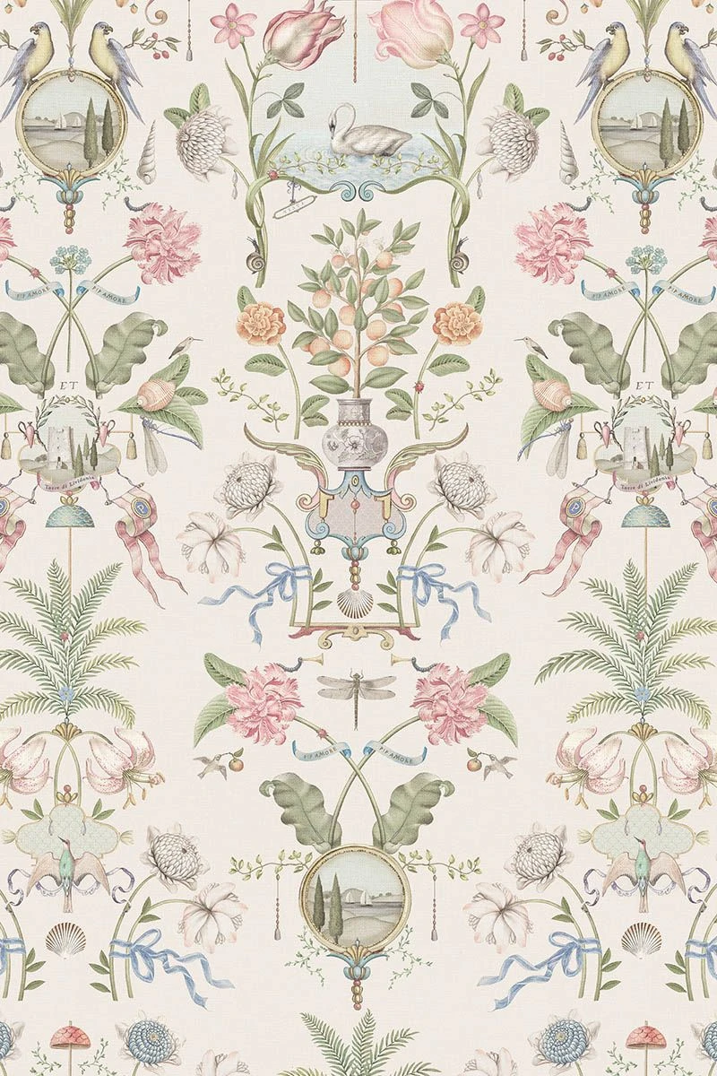 Give your home a magical make-over with this stunning Festa di Lividonia wallpower. The design is reminiscent of a mural in a stately country home. It is symmetrically composed of flowers, birds and ornaments representing impressions of Italy. This wallpower is a genuine eye-catcher in any room! The Festa Di Lividonia wallpower is also available in light mauve.