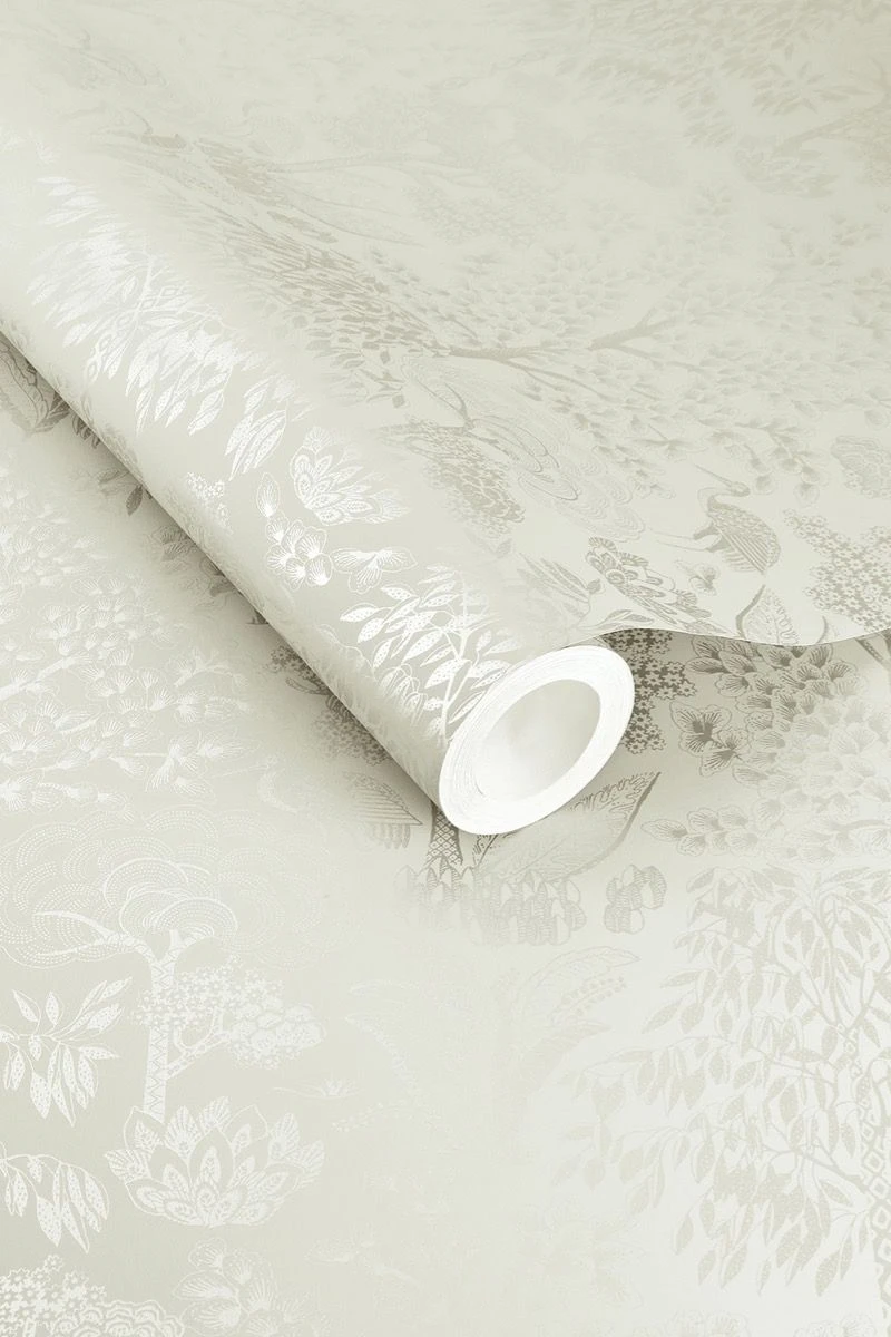 Give your home a magical make-over with this stunning Origami wallpaper in the colour off white/silver. The design has a repetitive pattern with stylised trees and birds. The matte background with metallic print gives the wallpaper a unique and sophisticated feel. The Origami wallpaper is available in different colours: light green/silver, ochre/gold, terra/rosegold and dark blue/rosegold.