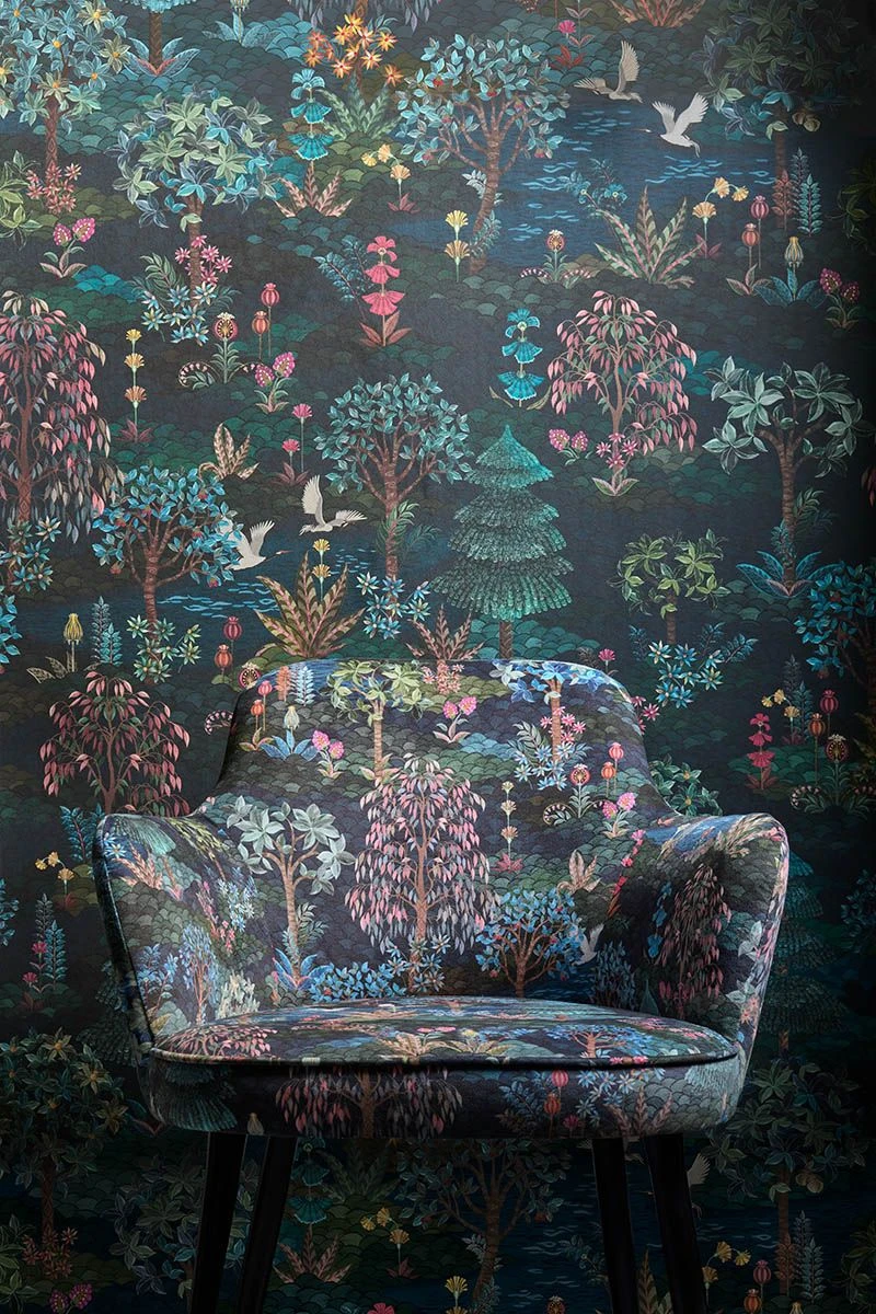 Give your home a magical make-over with this stunning Pip Garden wallpower. The design features an enchanting floral print against a background with shades of deep blue and green, with cranes flying through a landscape of hand-drawn trees and plants over hidden pools.