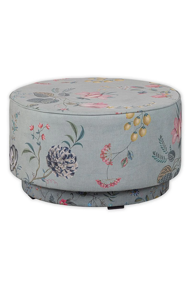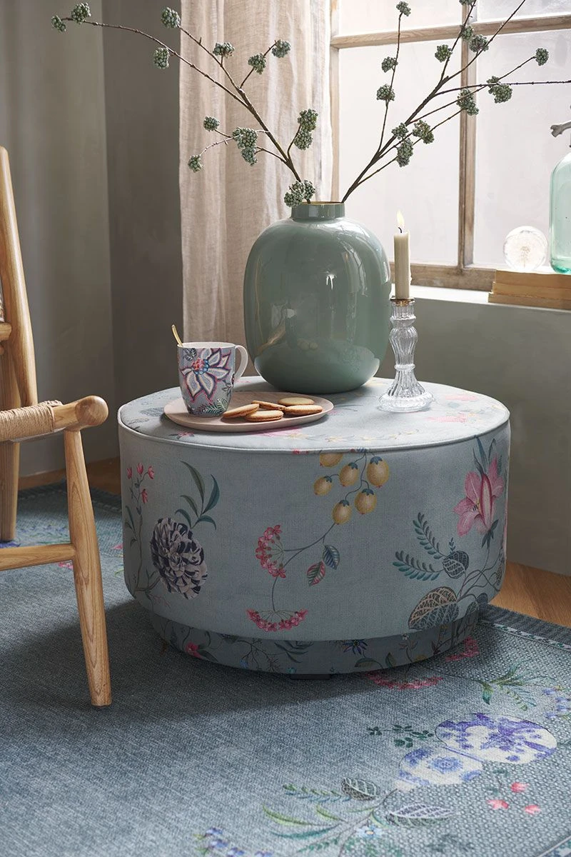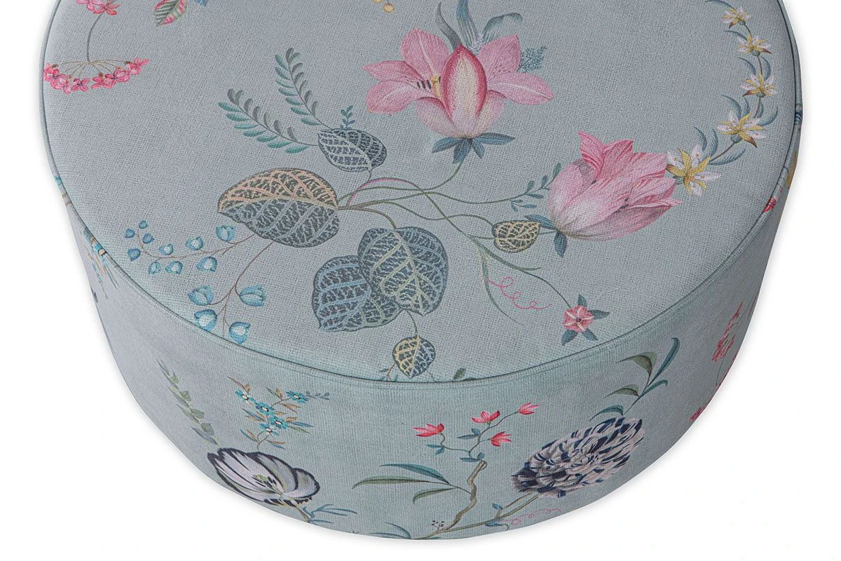 The low green Fleur Grandeur stool in soft pastel shades has a fresh look & feel. The design features a variety of imaginative wildflowers and elegantly positioned flower branches with dahlias, bright blue cornflowers and an array of summer fruits. Combine the stool with the matching Fleur Grandeur by Pip green carpet. Use the stool as an extra seat or comfortable foot rest.