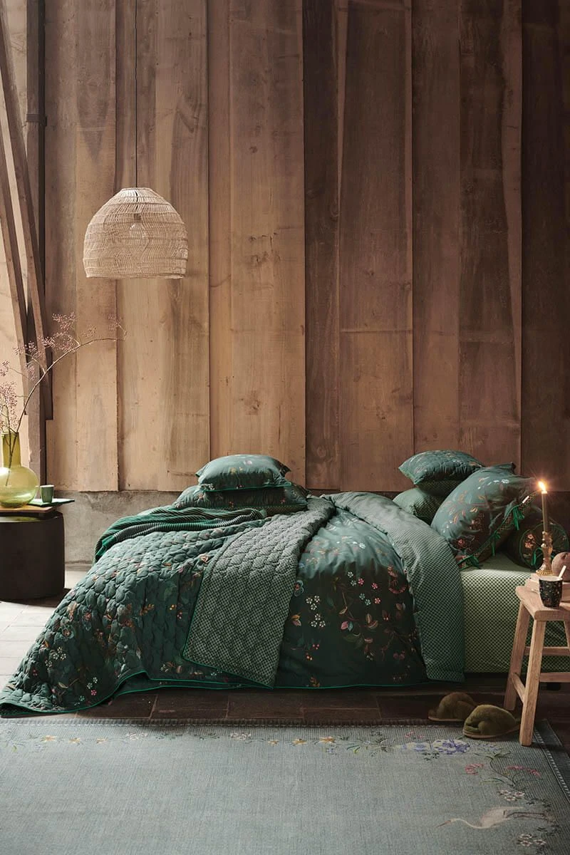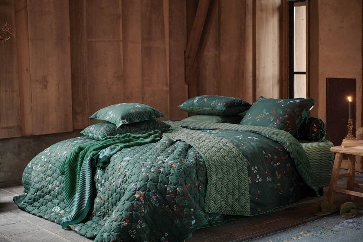 This green crochet blanket is decorated with the Bonnuit design. This print is made up of a two-tone crochet pattern on the front and the same pattern in reverse colors on the back. The blanket has a coarse knitted structure.
