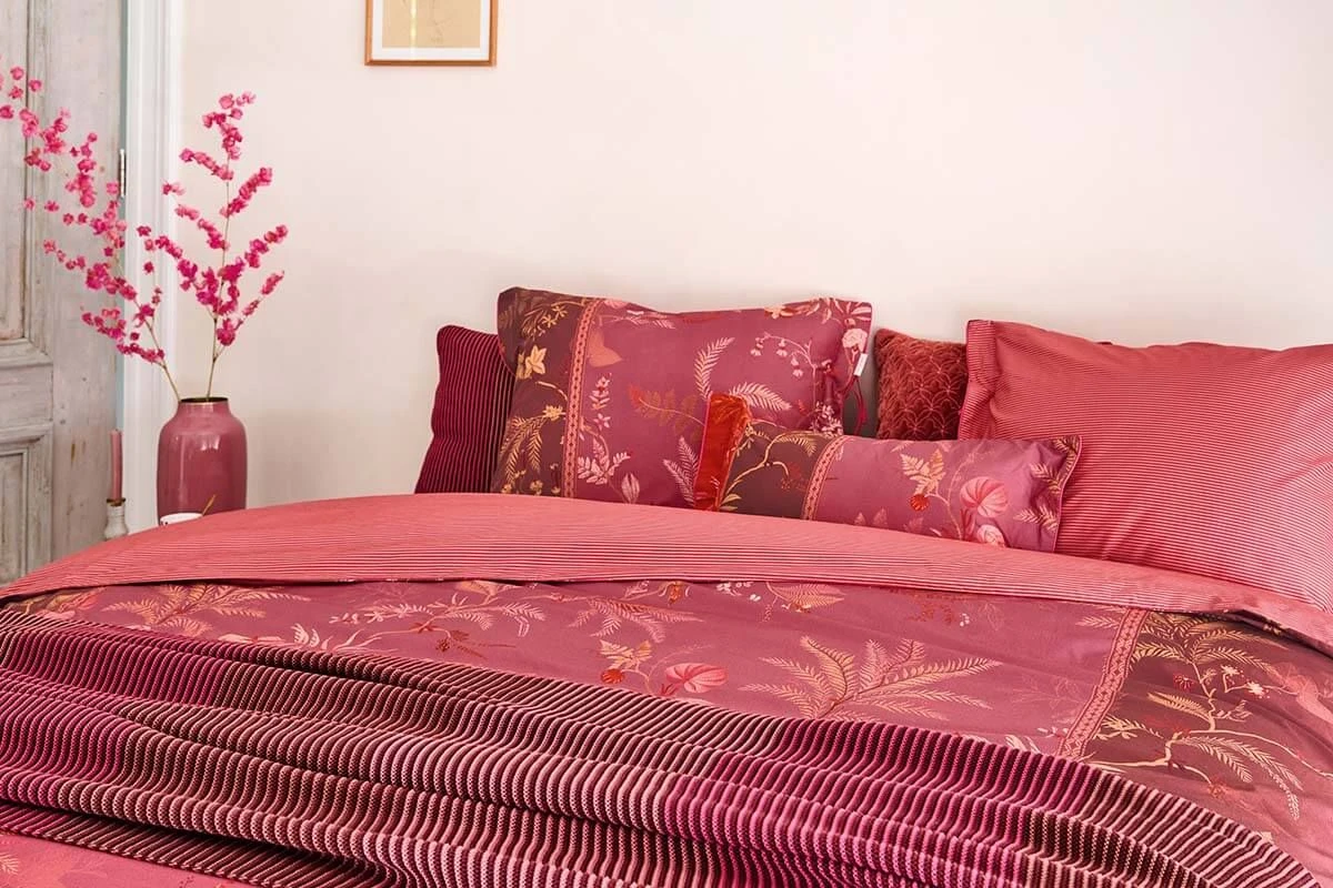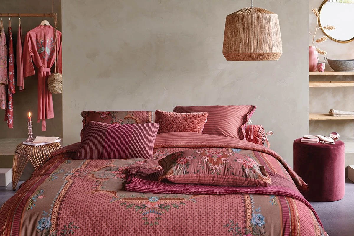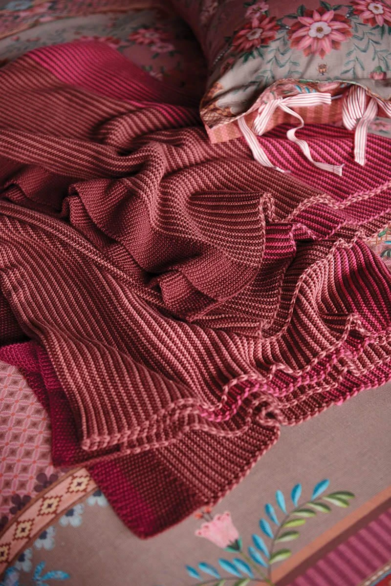 This pink crochet blanket is decorated with the Bonnuit design. This print is made up of a two-tone crochet pattern on the front and the same pattern in reverse colors on the back. The blanket has a coarse knitted structure.